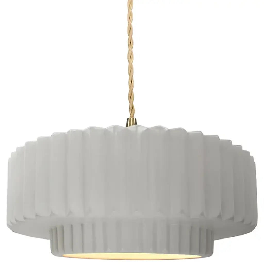 Brighten your space with modern sophistication with the installation of Justice Design's Radiance Tier Pleated Pendant. Ideal for illuminating your kitchen or dining area, this chic pendant light fosters a welcoming ambiance. Its contemporary design seamlessly merges style and functionality, making it a superb fit for any modern setting. Crafted from durable ceramic, it ensures longevity and enduring charm. Versatile enough to serve as a focal point in any room, this pendant from Justice Design delivers a stunning lighting solution that effortlessly marries style with practicality.
