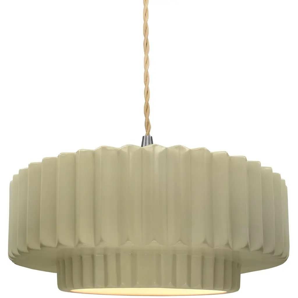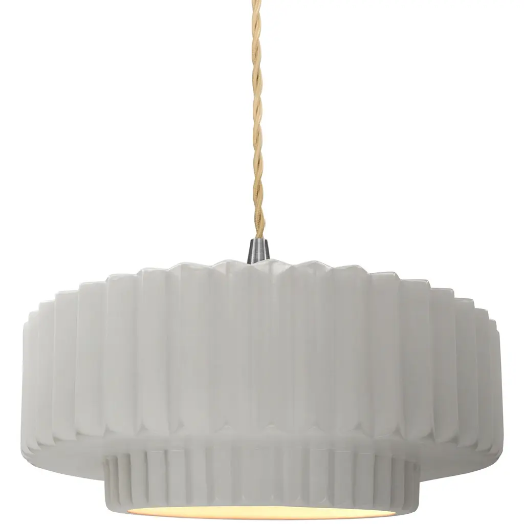 Brighten your space with modern sophistication with the installation of Justice Design's Radiance Tier Pleated Pendant. Ideal for illuminating your kitchen or dining area, this chic pendant light fosters a welcoming ambiance. Its contemporary design seamlessly merges style and functionality, making it a superb fit for any modern setting. Crafted from durable ceramic, it ensures longevity and enduring charm. Versatile enough to serve as a focal point in any room, this pendant from Justice Design delivers a stunning lighting solution that effortlessly marries style with practicality.