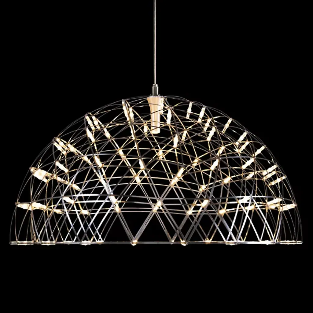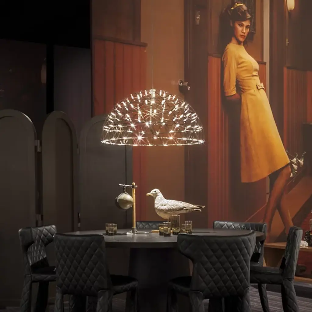 Bring the intricate beauty of the brilliant night sky indoors with the Raimond II Dome LED Pendant from Moooi. Open, elegant, and appealingly retro, it extends down along a slender cable suspended from a low-profile canopy, using a smooth central finial with an inset LED to support a double-layer dome shade of clear PMMA material. The two layers are held apart by a strong geodesic dome structure of slender steel braces, held apart by dimmable LED lamps that offer an evenly-spaced scattering of pleasing ambiance.
