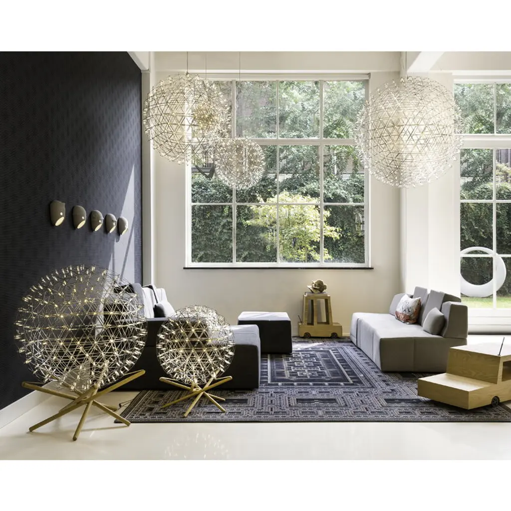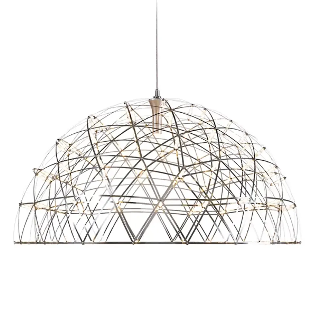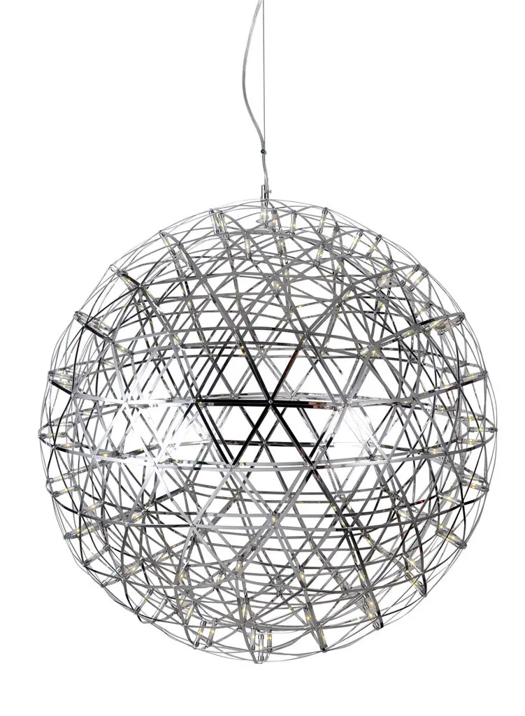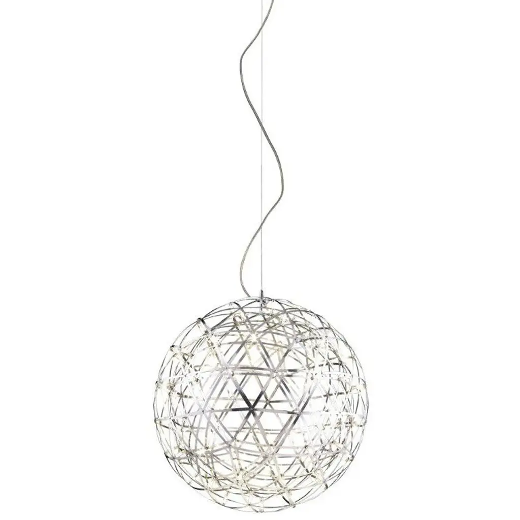 Moooi’s Raimond II R43 pendant brings the unique beauty of a starry night into your home. Designed by mathematician Raimond Puts, the suspension light consists of a perfectly round steel net lit with a multitude of tiny LED bulbs that resemble stars twinkling in a night sky. Create the perfect atmosphere in your home with the dimmable Raimond pendant or combine several pendants to form a whole constellation reminiscent of fireworks lighting up the sky. Raimond Puts's inspiration for the Raimond lighting collection was the geodesic dome, a hemispherical construction consisting of triangular elements. Developed by American architect Buckminster Fuller in the 1940s, the geodome has been applied to buildings like greenhouses and glass igloos, for example – but Puts envisioned it as a luminaire. It took Puts almost 40 years to develop the lamp design, conducting endless research and building numerous prototypes until, in 2009, the collection's first luminaires were ready to be introduced to the world. As a mathematician, Puts was also fascinated with prime numbers and decided to give all Raimond lights diameters that were based on a specific prime number (like 43, for example). In 2021, the Raimond pendant was updated with new dimming possibilities and more efficient LED lights, allowing the luminaire to shine even brighter. The modernized version was given the rather regal name Raimond II.