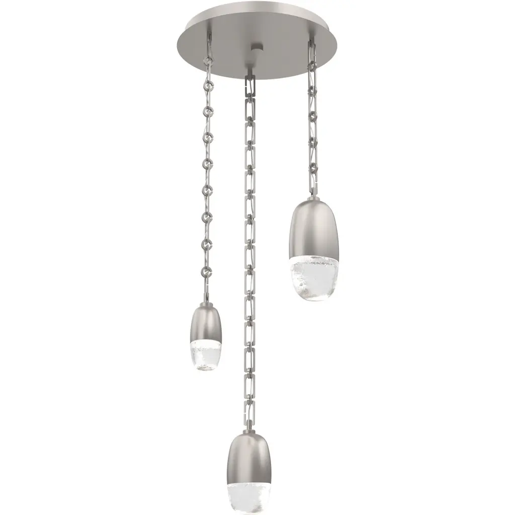 Evoking the ethereal beauty of a spring shower, this magnificent round raindrop multi-pendant chandelier seamlessly fuses sculptural metalwork with luxuriously thick artisan-blown glass handcrafted in Hammertons Salt Lake City facility. LED light illuminates the glass shade without the distraction of a filament bulb. Height is adjustable and offered in your choice of finishes. Suspension options include cloth-braided cord or handcrafted chain in three vintage-inspired styles.