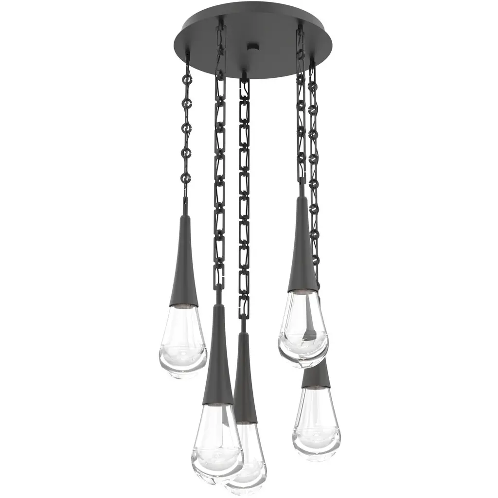 Evoking the ethereal beauty of a spring shower, this magnificent round raindrop multi-pendant chandelier seamlessly fuses sculptural metalwork with luxuriously thick artisan-blown glass handcrafted in Hammertons Salt Lake City facility. LED light illuminates the glass shade without the distraction of a filament bulb. Height is adjustable and offered in your choice of finishes. Suspension options include cloth-braided cord or handcrafted chain in three vintage-inspired styles.