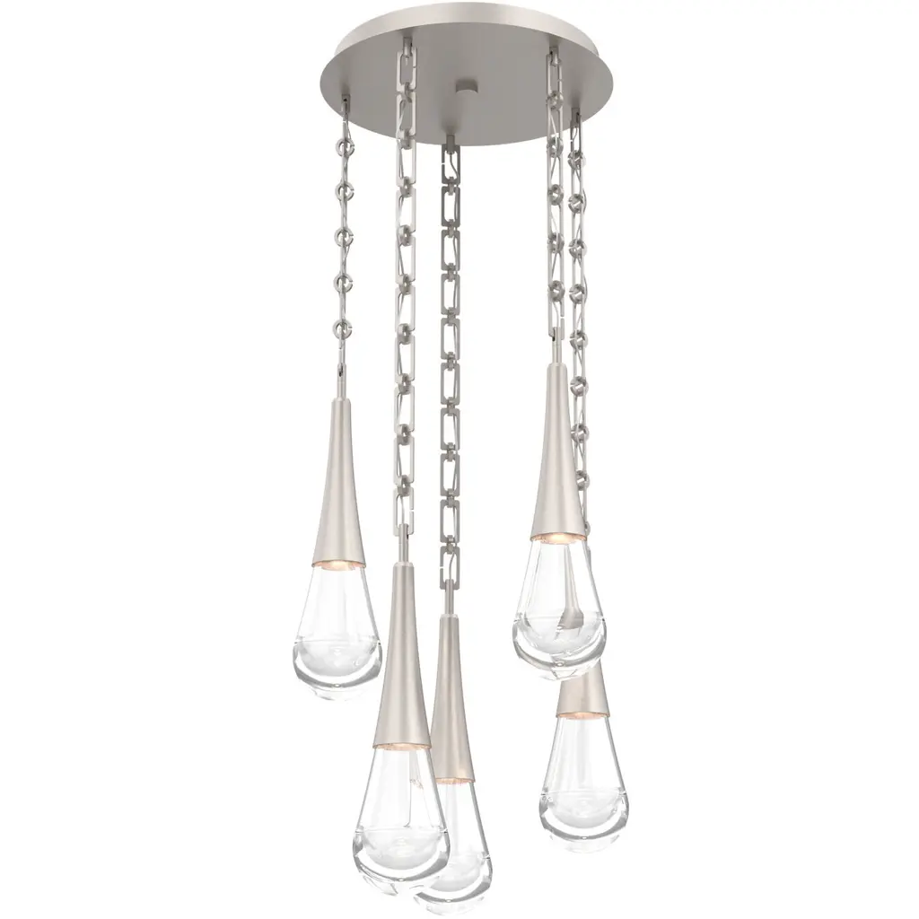 Evoking the ethereal beauty of a spring shower, this magnificent round raindrop multi-pendant chandelier seamlessly fuses sculptural metalwork with luxuriously thick artisan-blown glass handcrafted in Hammertons Salt Lake City facility. LED light illuminates the glass shade without the distraction of a filament bulb. Height is adjustable and offered in your choice of finishes. Suspension options include cloth-braided cord or handcrafted chain in three vintage-inspired styles.