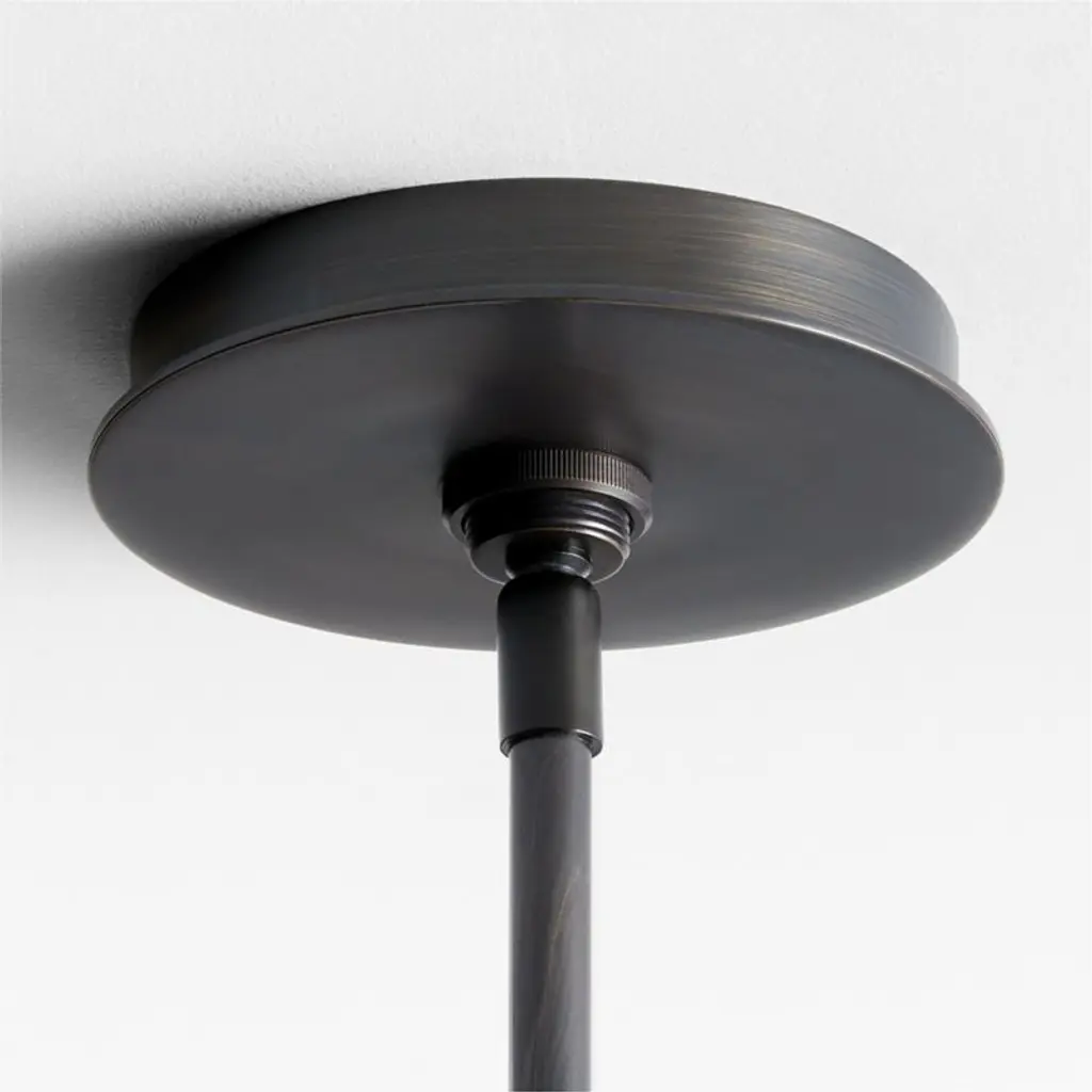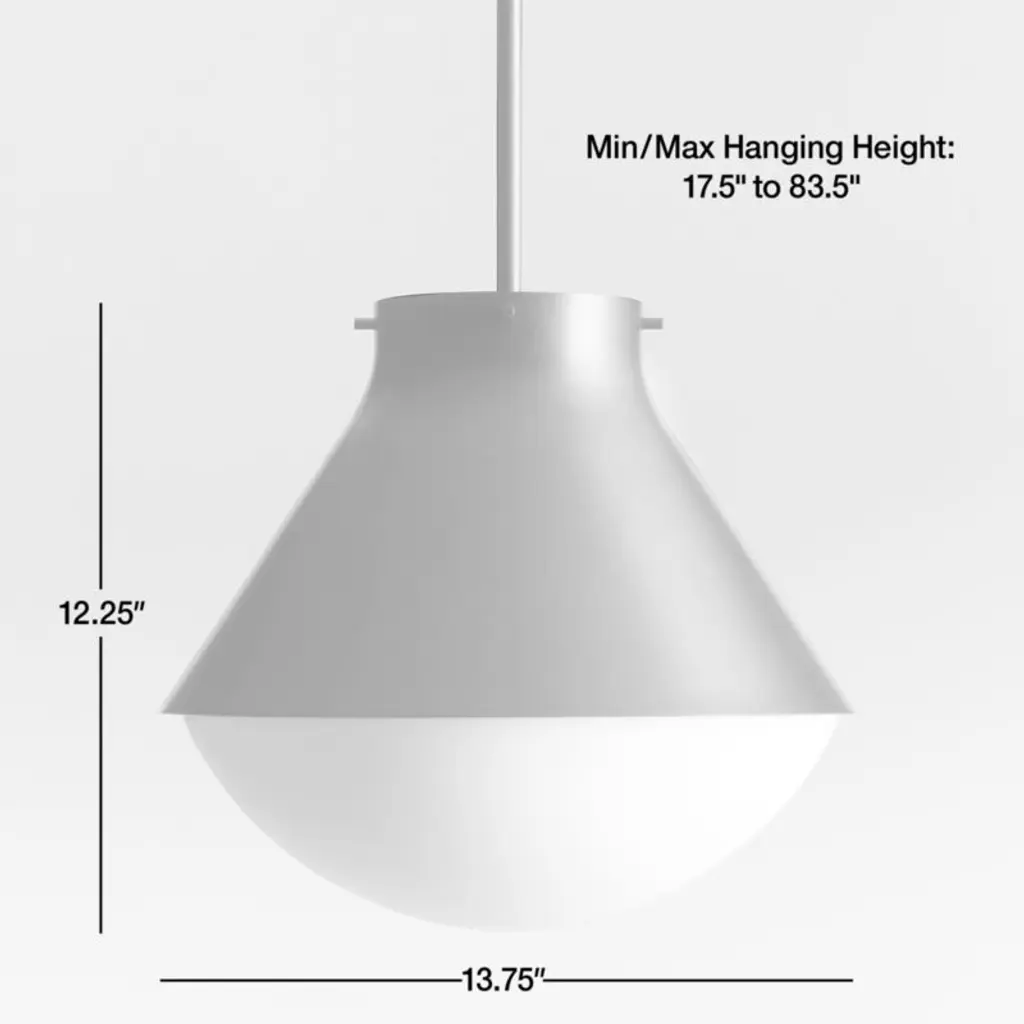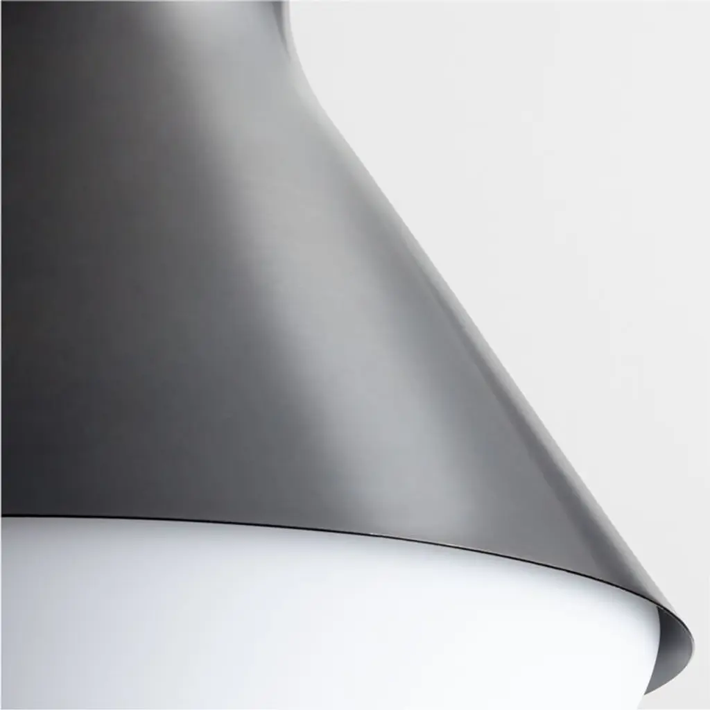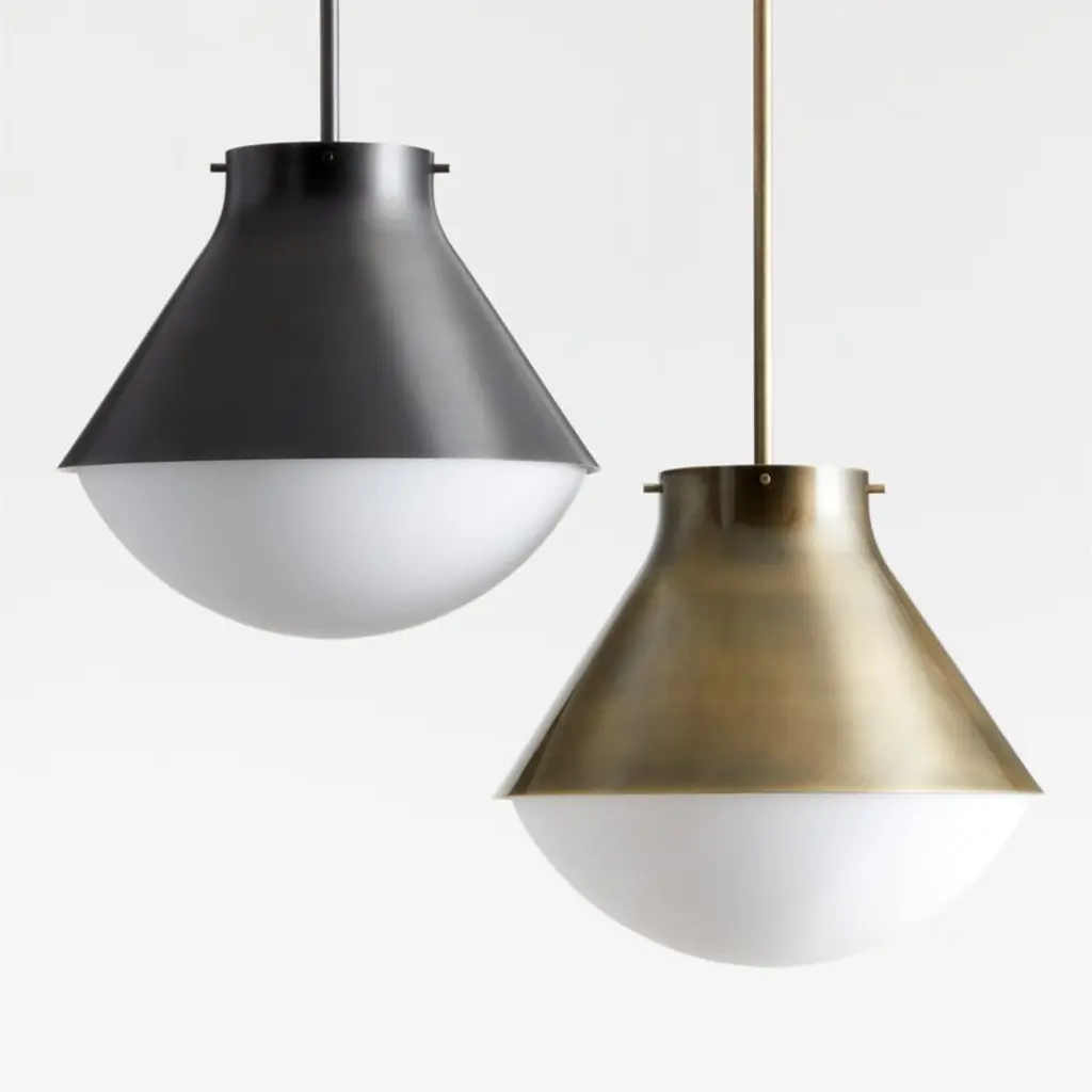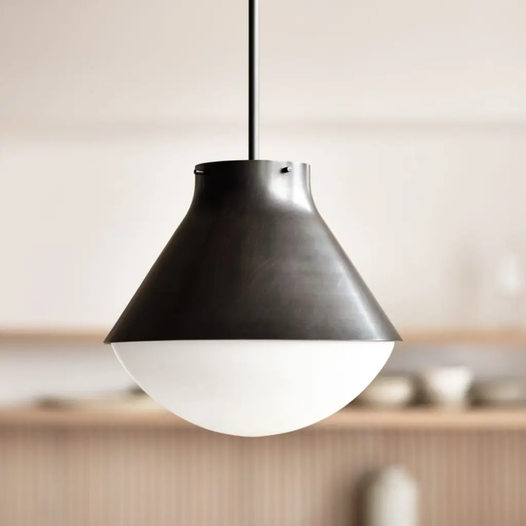 Rainier softens the classic conical pendant by finishing a flared shade with a curve of glass to create a teardrop-like silhouette. The high-contrast pairing of the blackened steel fixture with the white milk glass is graphic, and the frosted glass shade softly diffuses light. We love the linear look of multiple pendants hung above a dining table, kitchen island or down a high-ceilinged hallway.