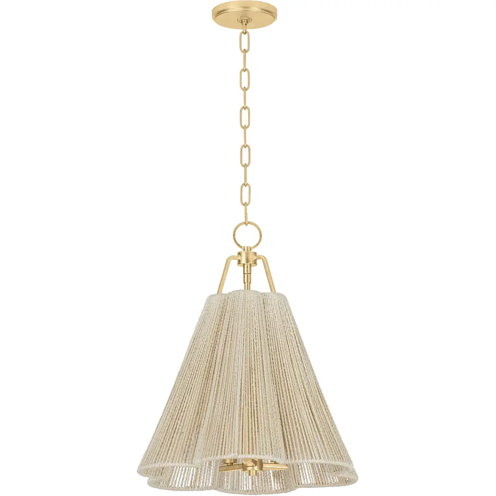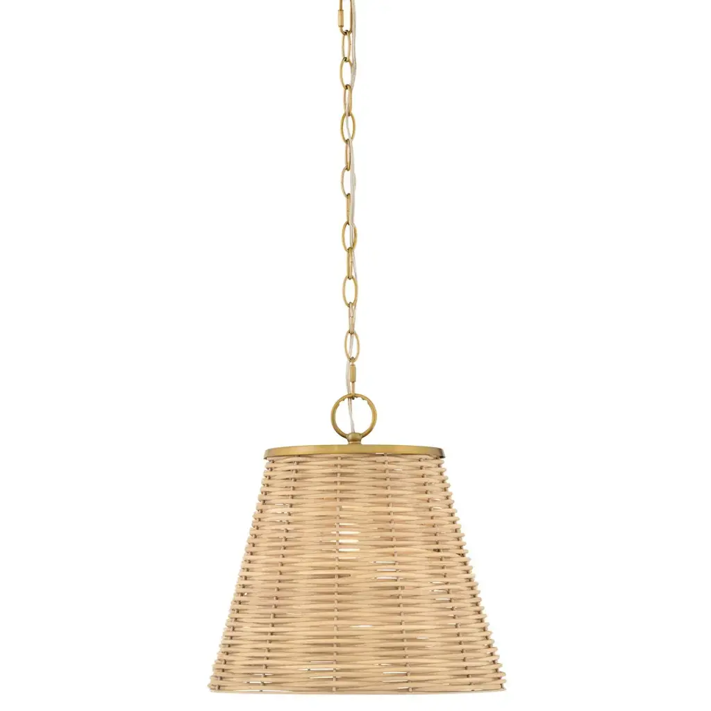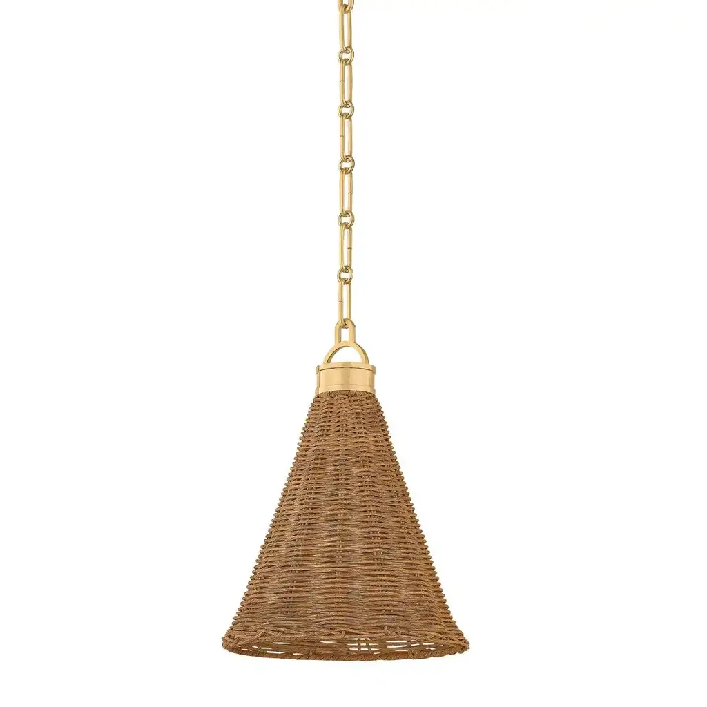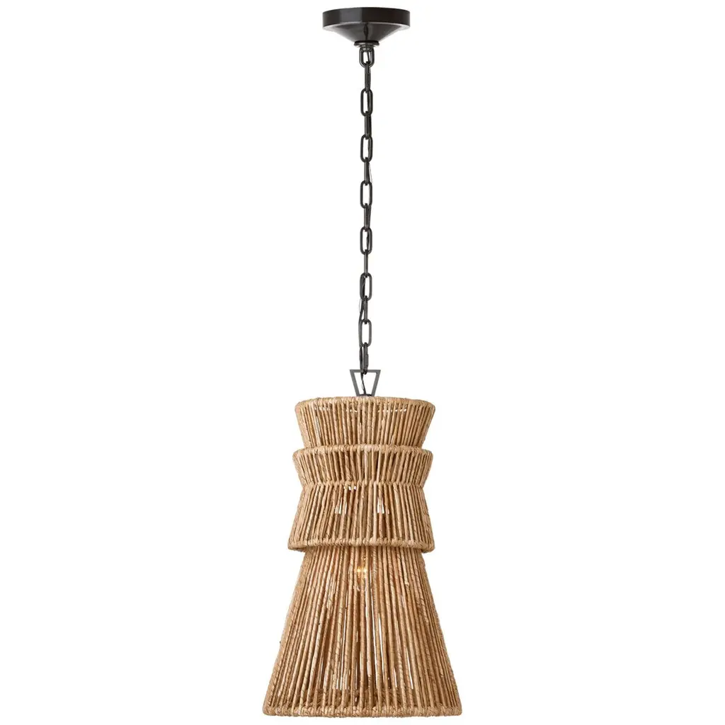 Crafted with a hand-knotted jute string technique, the designs of the Raphael family are like artful ornaments. Each fixture has a central cuff that cinches the conical shades, giving them their distinctive shapes. A hidden bulb radiates light through the gaps in the weave, creating a warm and welcoming glow. For added cohesion, the pendants feature a decorative string-wrapped loop that connects to a Patina Brass chain. Due to the one-of-a-kind nature of the medium, exact colors and patterns may vary slightly from the image shown.
