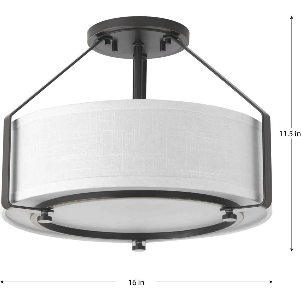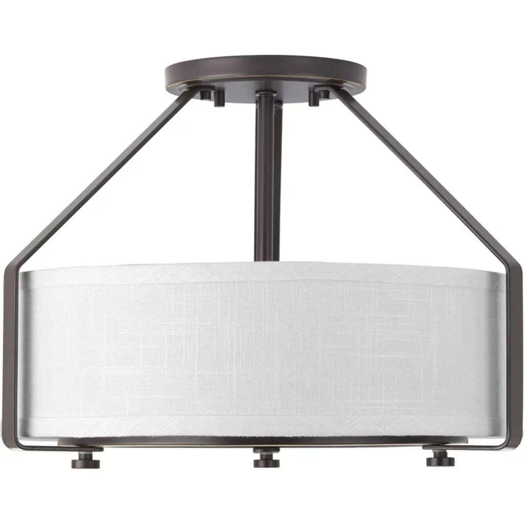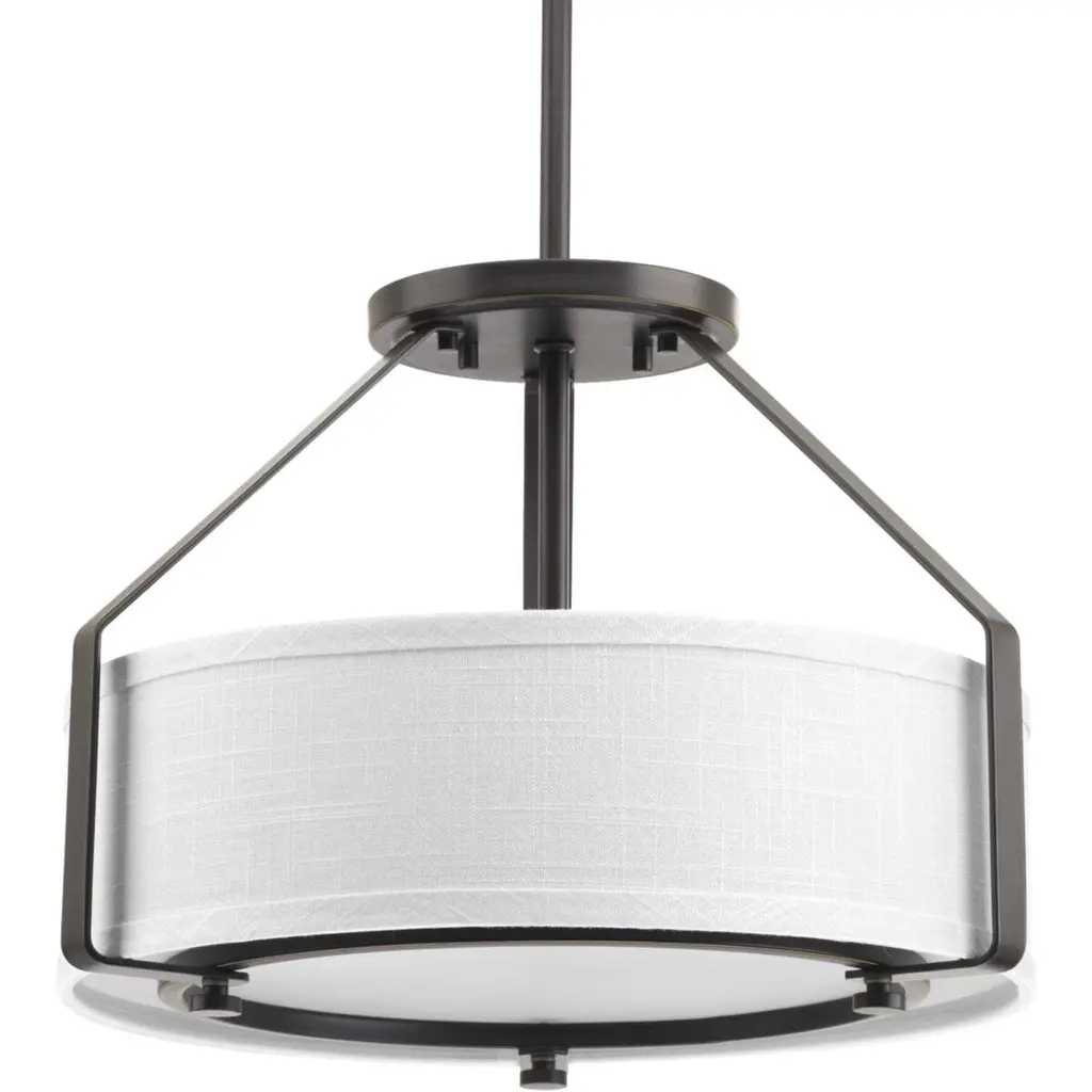The three-light semi-flush offers a sleek metal frame that supports a low-slung shade to create Ratio’s casual modern style. The frame’s proportion to the white linen drum shade evokes a perfect ratio for lighting. Includes a polished glass exterior, etched glass interior diffuser that offers an elegant appeal and is easier to clean – offering both fashion and function. This fixture can be mounted as a semi-flush or used as a hanging pendant for a wide variety of applications. Antique Bronze finish.