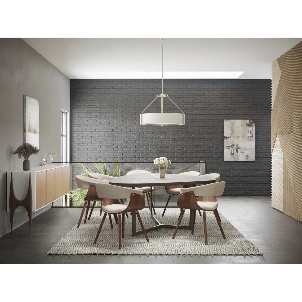 The four-light pendant offers a sleek metal frame that supports a low-slung shade to create Ratio’s casual modern style. The frame’s proportion to the white linen drum shade evokes a perfect ratio for lighting. Includes a polished glass exterior, etched glass interior diffuser that offers an elegant appeal and is easier to clean – offering both fashion and function. Brushed Nickel finish.
