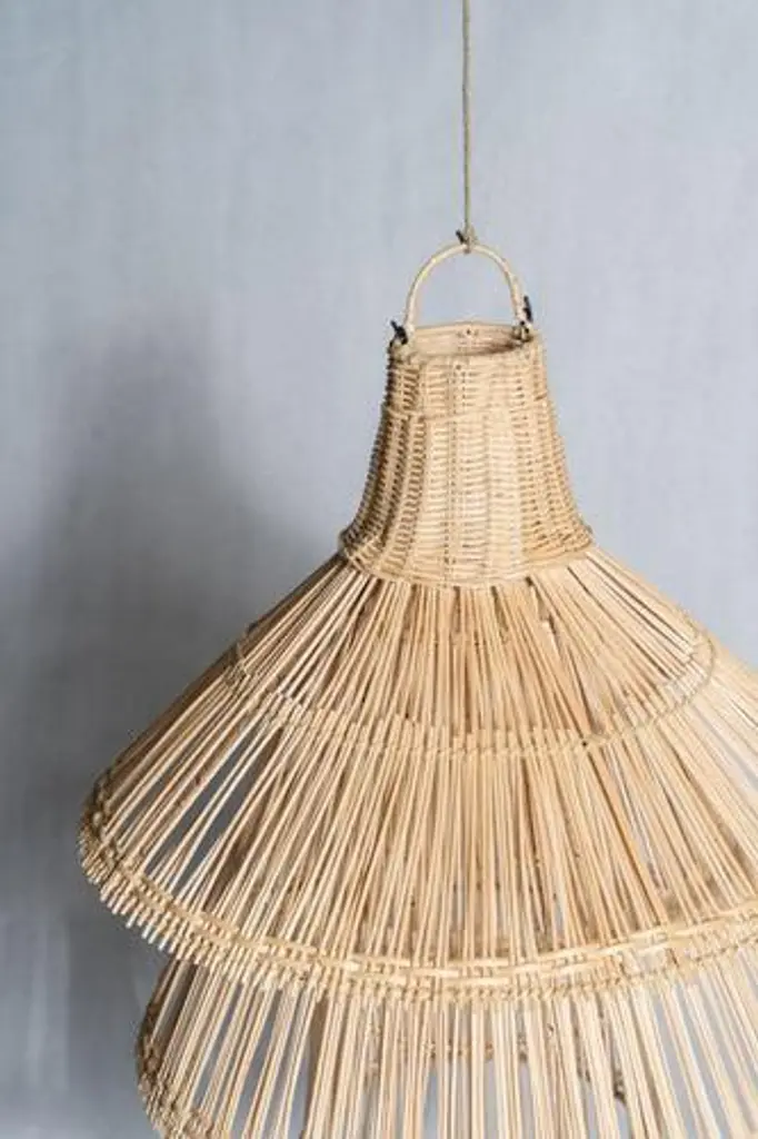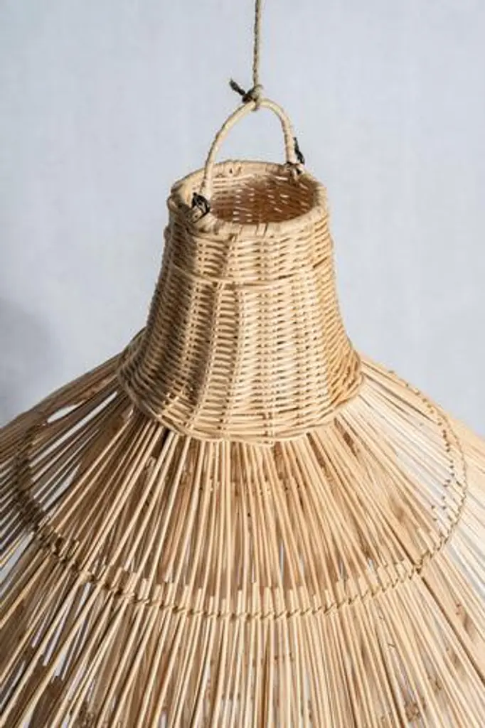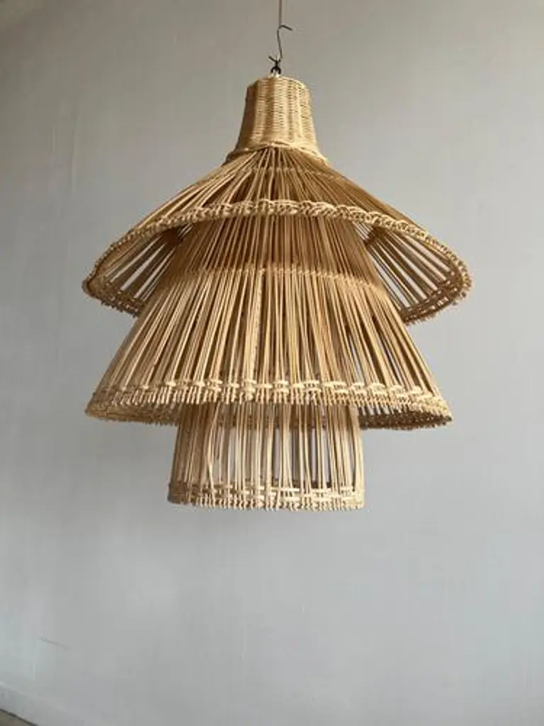 Rattan pendant or light fixture in the shape of an Asian lantern, superposition of several cones. Beautiful quality and beautiful work of the rattan which gives an elegant and airy geometric shape. Ideal for giving a warm touch to your interiors, bedrooms or living room. Lampshade alone without electrical system to choose according to the decoration of your interior. Height: 70cm; Diameter: 70cm. Up to 250V (Europe/UK Standard).The wiring of this item may be original and might need replacement, if not specified otherwise.
