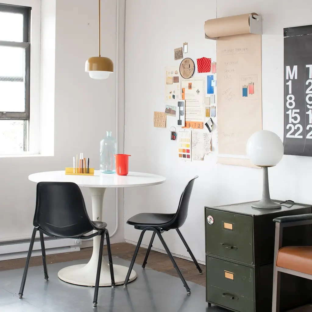 As part of our Benchmade line, Ray gets its name and inspiration from the playful yet sophisticated spirit present in all of Ray Eames's work. This iconic fixture puts a modern twist on a classic mid-century design. Its streamlined silhouette and joyful color palette—each one is painted on our factory’s fourth floor—lend itself well to an array of interiors. Each fixture is paired with a glass diffuser to gently filter light while a custom lever makes changing out the lightbulbs easy and effortless.Read our guides on how to hang pendants and chandeliers and how to layer different types of lighting. Shop the Ray Lighting Collection