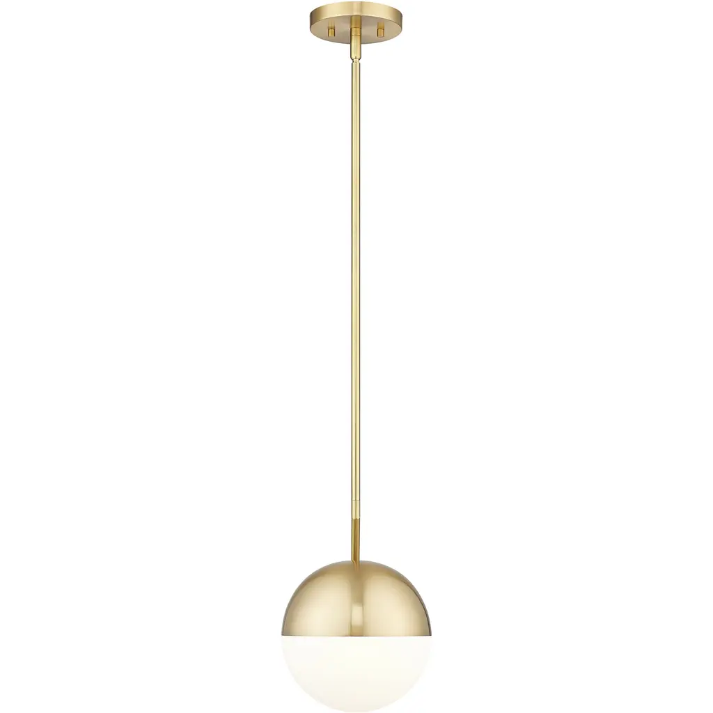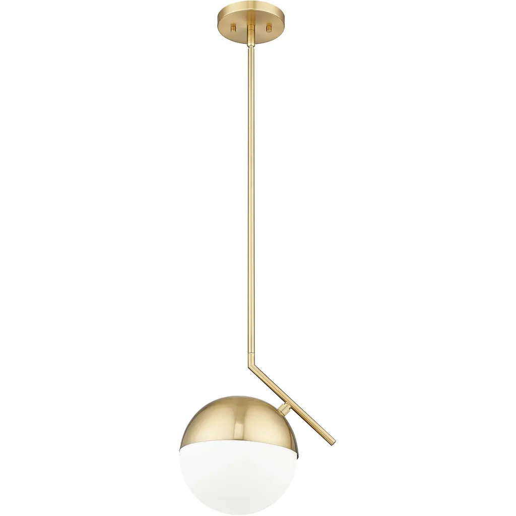A distinctive silhouette is created with the angular arm featured on this mid-century modern one-light pendant. Perfect alone or in series to create a larger installation, it boasts a rich modern gold finish that imparts impeccable warmth and inviting ambiance. Its orb shade adds smooth curves, complete with a metal shield and opal glass for excellent illumination.