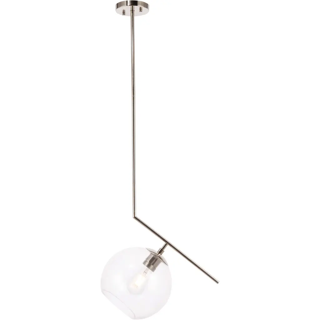 A distinctive silhouette is created with the angular arm featured on this mid-century modern one-light pendant. Perfect alone or in series to create a larger installation, it boasts a rich modern gold finish that imparts impeccable warmth and inviting ambiance. Its orb shade adds smooth curves, complete with a metal shield and opal glass for excellent illumination.
