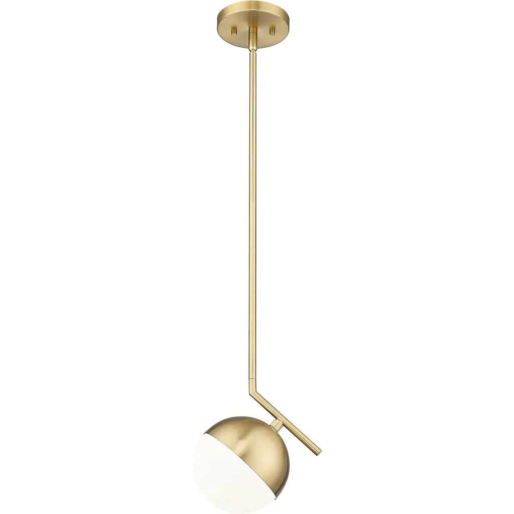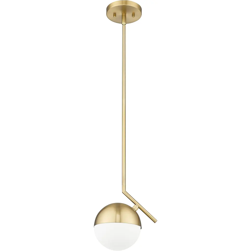 Capture the magic of a warm, rich modern gold finish on this mid-century modern one-light pendant. It blends contemporary angularity with vintage flair, creating a striking focal point alone or in multiples to create a larger installation. It's complete with an orb shade created with a metal shield and opal glass.