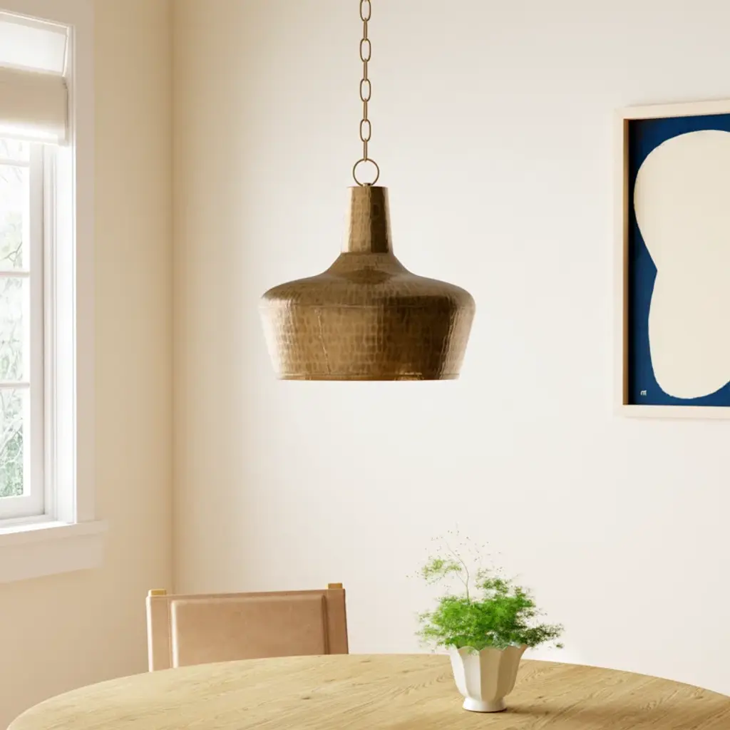 The Jets Pendant Lamp effortlessly combines modern and traditional elements, making it a versatile addition to any space. Its hammered brass finish brings warmth and texture, while the durable iron construction ensures lasting quality. The clear 7ft cord offers flexible hanging options, allowing this lamp to enhance various room styles. Whether your decor is contemporary or classic, this lamp adds a cozy yet refined ambiance.