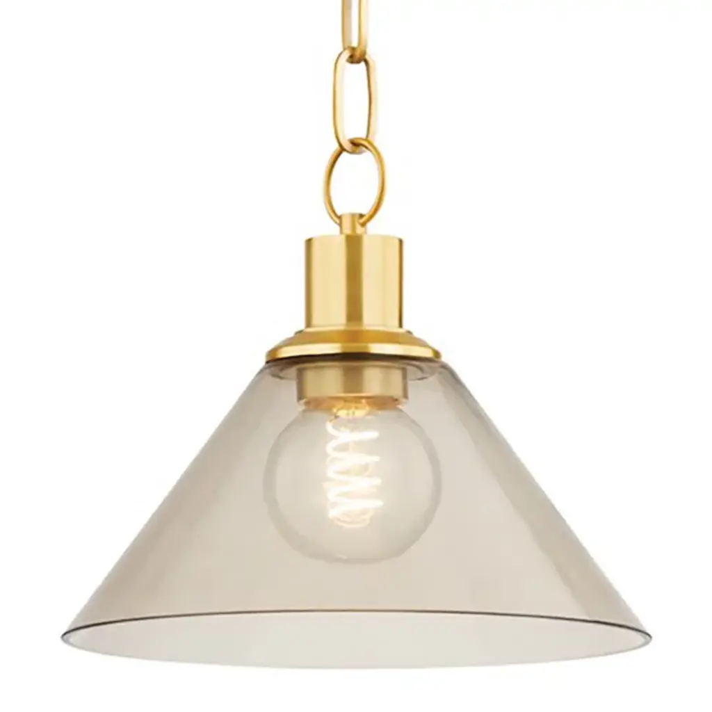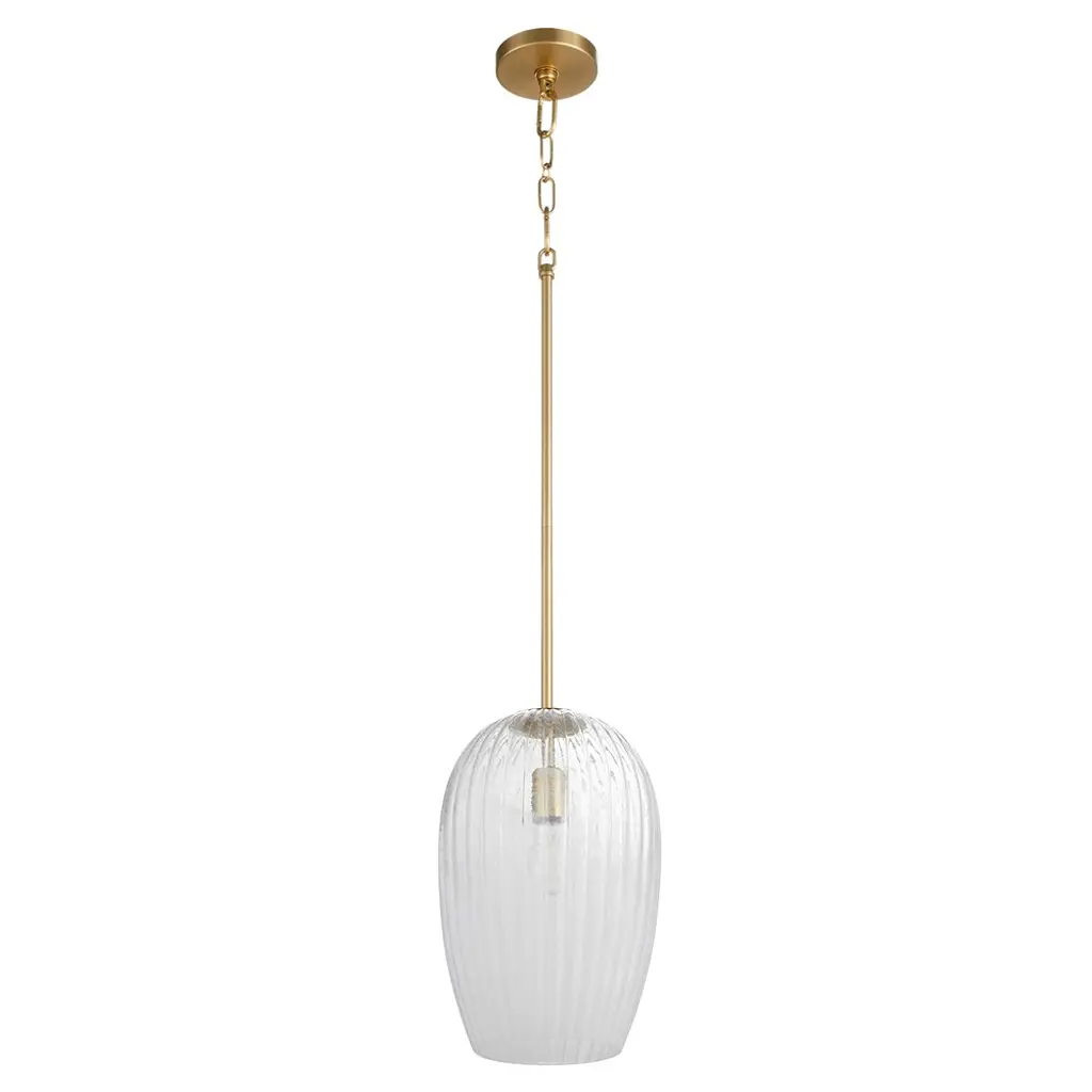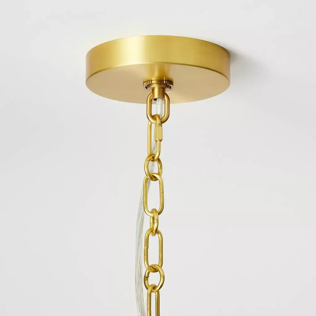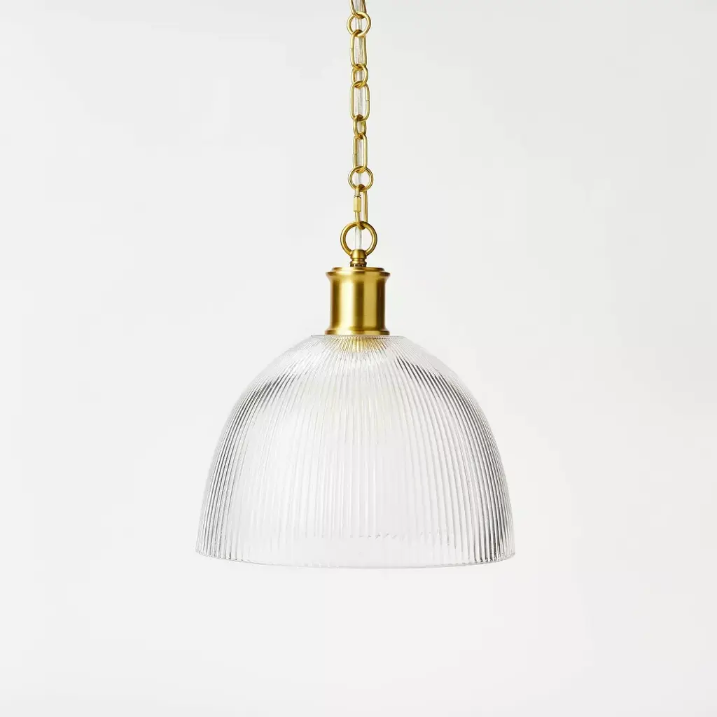Bring a boost of brightness and a touch of modern style to any arrangement with this Reeded Brass Glass Pendant from Threshold™ designed with Studio McGee. Sleek and streamlined, this brass glass pendant features a dome glass shade attached to a gold-finish metal body to add warmth and a welcoming glow to your indoor space. Perfect to set above your kitchen island or in your entryway, this glass pendant offers a stylish lighting solution that's easy to match with an array of decor styles.