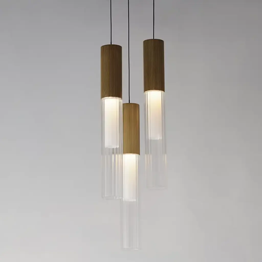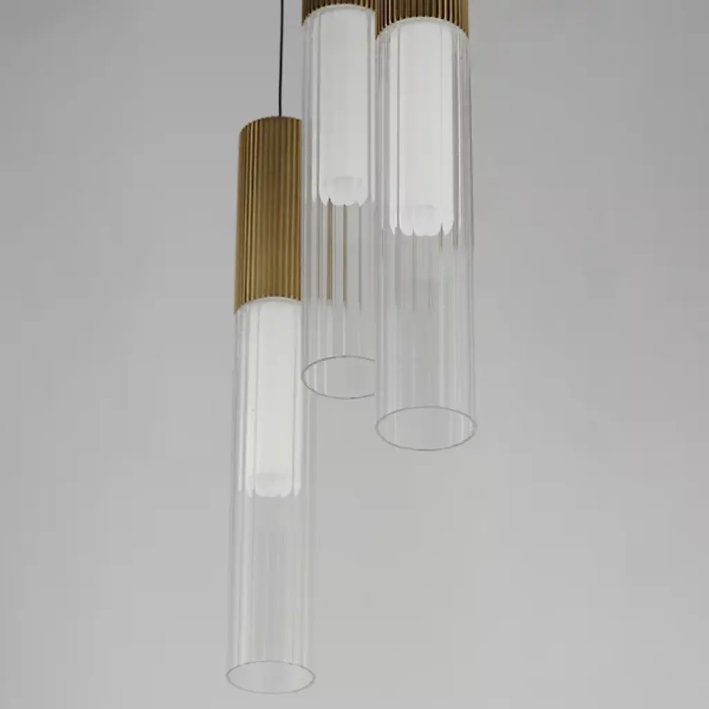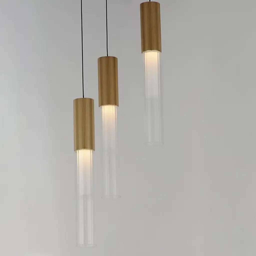 The Reeds LED Multi-Light Pendant from ET2 Lighting has reeded glass tubes that are paired with ribbed aluminum LED housings in a Gold finish. The interior frosted glass diffusers soften the high-powered LED boards concealed within. The low-voltage light sources are driven by a commercially rated range voltage LED drivers with universal dimming, allowing them to be used in both residential and decorative commercial or hospitality applications.