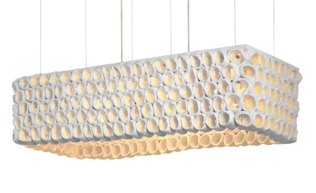 A fabulous statement fixture, the rectangular Reef is sure to be a conversation piece in any setting. Over a dining table, over a cocktail table, lighting a hall, this is a “wow” suspension light. Designed by Lorenzo Zanovello, the suspension is entirely hand-made in glossy white ceramic by Venetian artisans in Italy. Each piece varies slightly and reveals the hand of the artisan. The Reef is truly a sculptural “tour de force.” Available in two sizes.