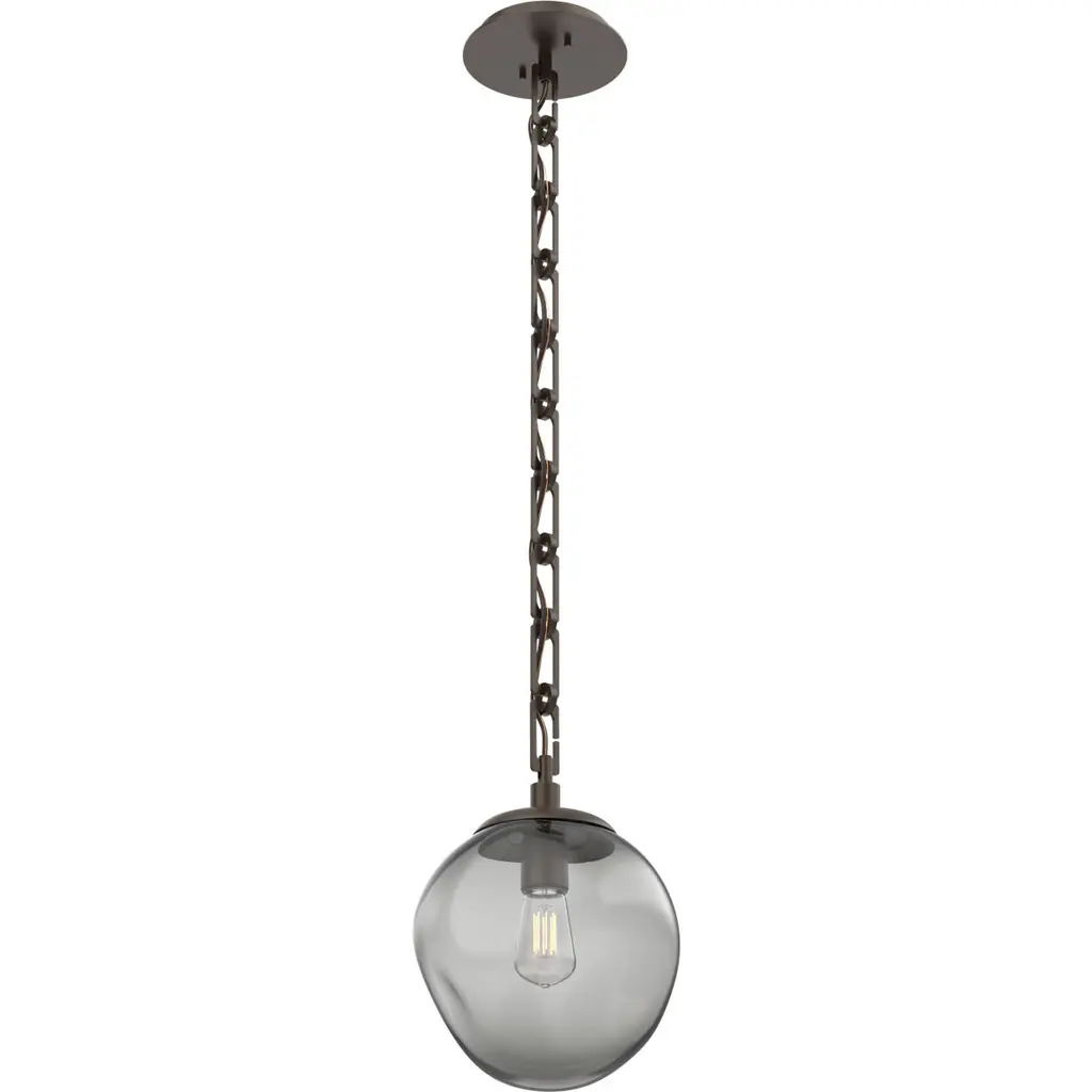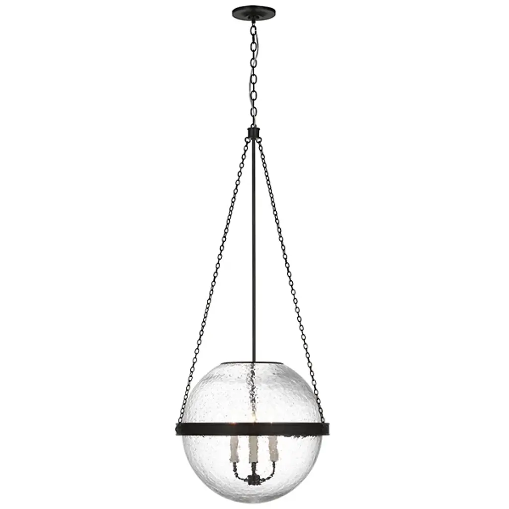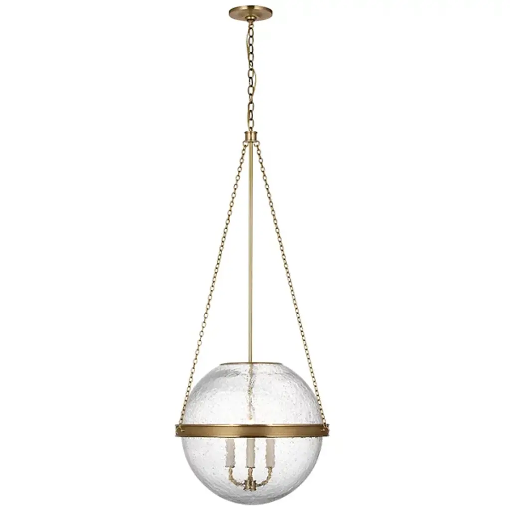 Presented by Visual Comfort Signature, the Reese Globe Pendant is designed by Marie Flanigan and made in the USA. It features an orb of clear restoration glass with a banded metallic accent gracefully surrounding the central perimeter. Suspended from artfully arranged chain link strands, the pendant provides a diffusion of light from within its central portion. With candelabra lamping, Reese emits a warm and inviting illumination that brings animation to the surrounding decor space.