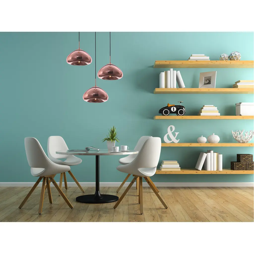Stunning beauty at its most minimal, Reflection collection hanging fixtures lend a futuristic splendor to a kitchen, living room, or bedroom. Spherical, hemispherical, or lantern-shaped glass shades seem to float in midair from their slender steel cords. Polished and glossy as a mirror itself, this design comes in opaque or striped chrome, copper, or gold finishes.