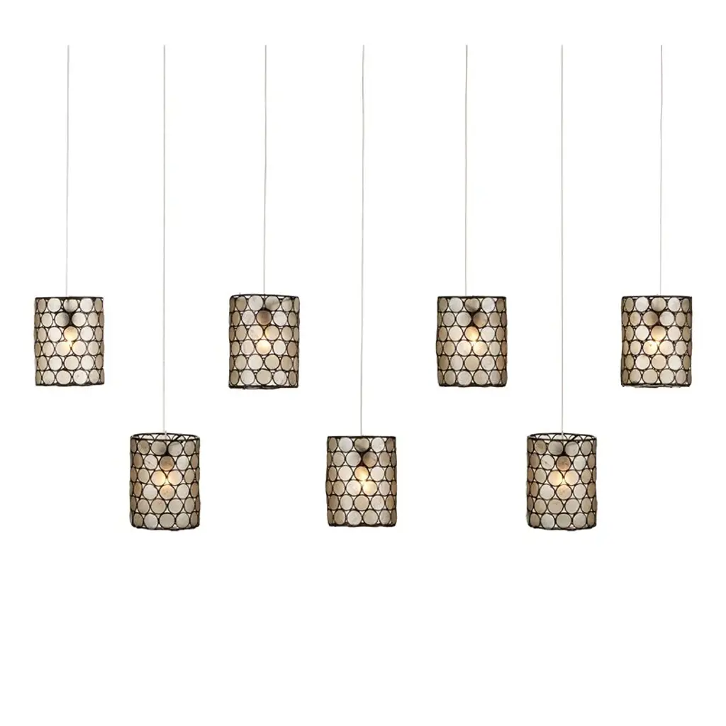 Natural Capiz shell and wrought iron in a Cupertino finish create a luminous circular pattern on the shades of the Regatta Rectangular 7-Light Multi-Drop Pendant. The cylindrical element has such a pleasing glow when light shines through the lustrous natural material. There is great artistry in achieving such a complex pattern, as each slice of shell has to be surrounded in metal and soldered into a frame once the metal circles are joined to each other. The canopies of the shell pendants in this collection are luminous in a painted silver finish.