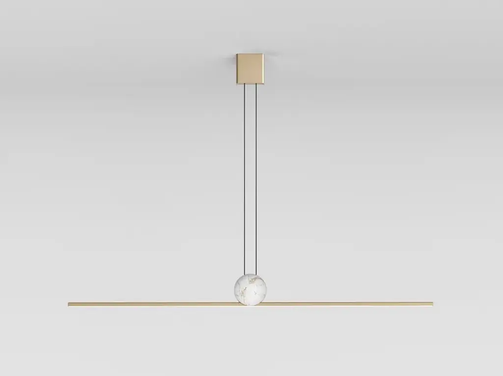 REGOLO is a suspension lamp with metal diffuser profile in matt black, matt champagne or warm grey. Decorative sphere in gold Calacatta marble or black marquinia.Module LED: 30wLumen: 2900CRI: >90Color Temperature: 3000KColor Temperature a richiesta: 2700KThe new medium version of Regolo completes the family and presents a decorative sphere and a linear light body that reaches 160 cm in length.