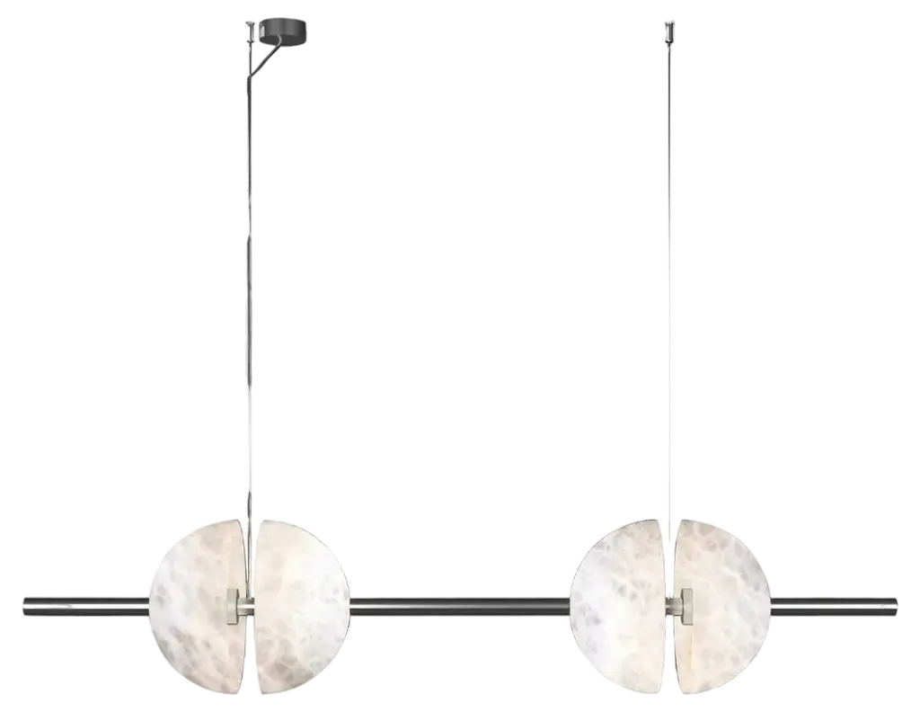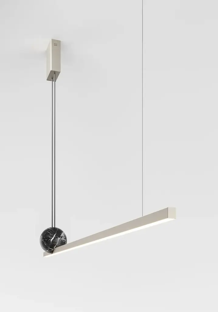 REGOLO MAXI is a suspension lamp with metal diffuser profile in matt black, matt champagne or warm grey. Decorative sphere in gold Calacatta marble or black marquinia.LED Module: 24wLumen: 2000CRI: >90Color Temperature: 3000KFeaturing minimal design the new Regolo presents a decorative sphere and a linear light body that reaches 180 cm in length and has three lighting modes, either upward or downward, individually or combined.