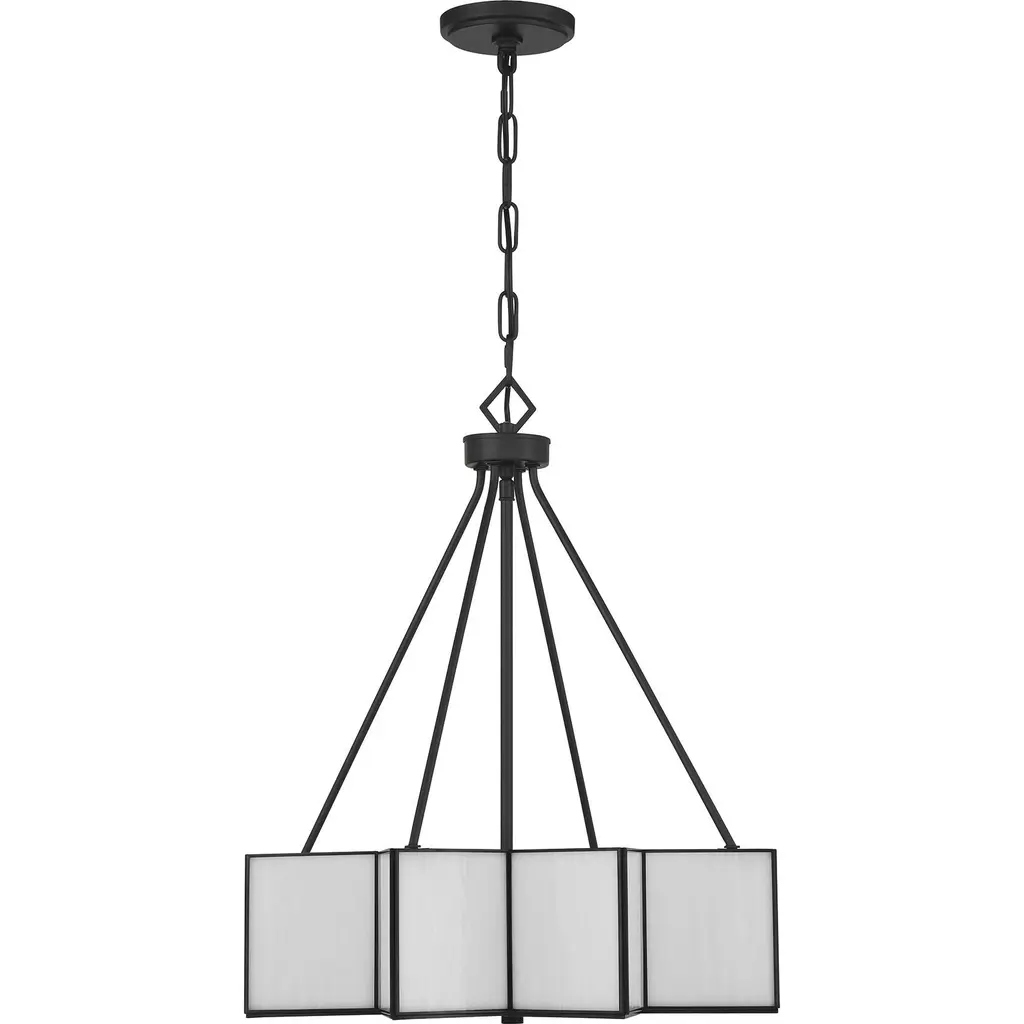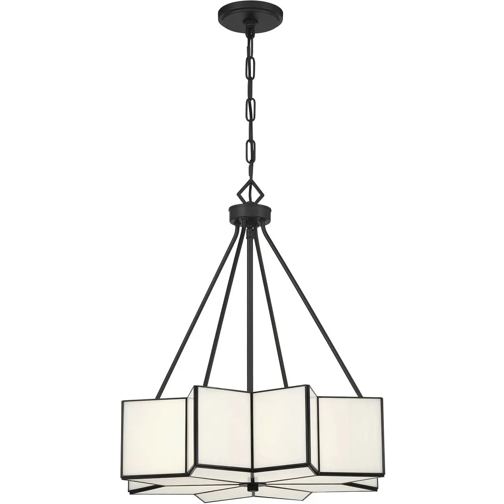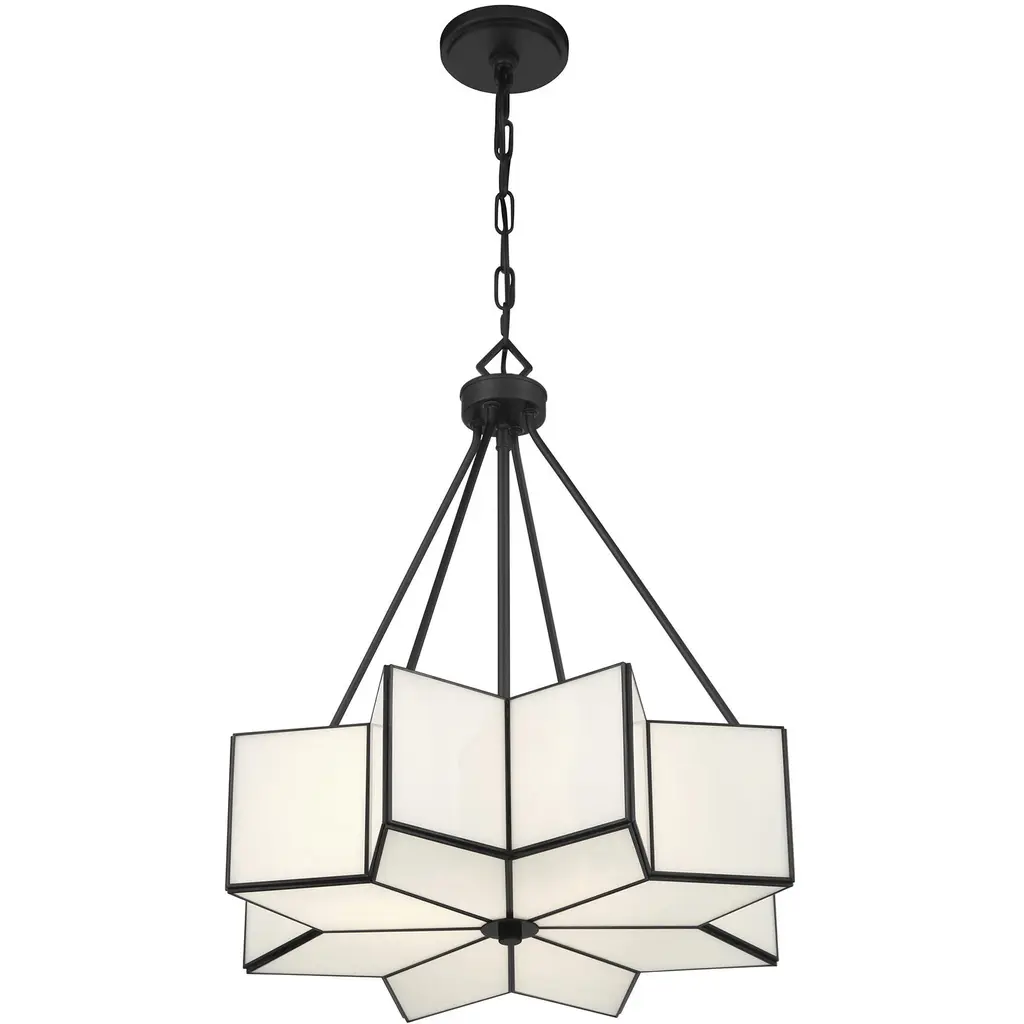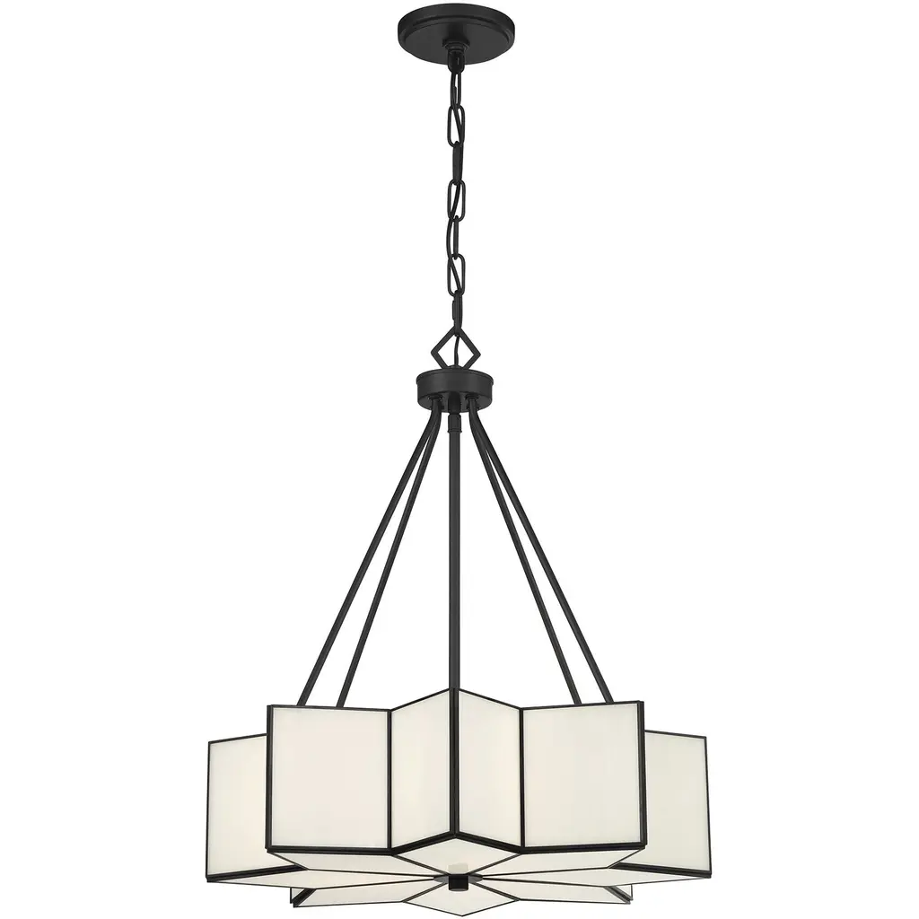 The Savoy House Reiling 3-light pendant is destined to shine in any space. Its eye-catching starburst shape is finished in Matte Black and decorated with panes of white glass. It is the perfect choice for bringing in Art Deco style glamour Reiling is 23.5" in height and 20" in width. It uses three standard size bulbs of up to 60 watts per bulb. Bulbs not included. Comes with 120" of chain.
