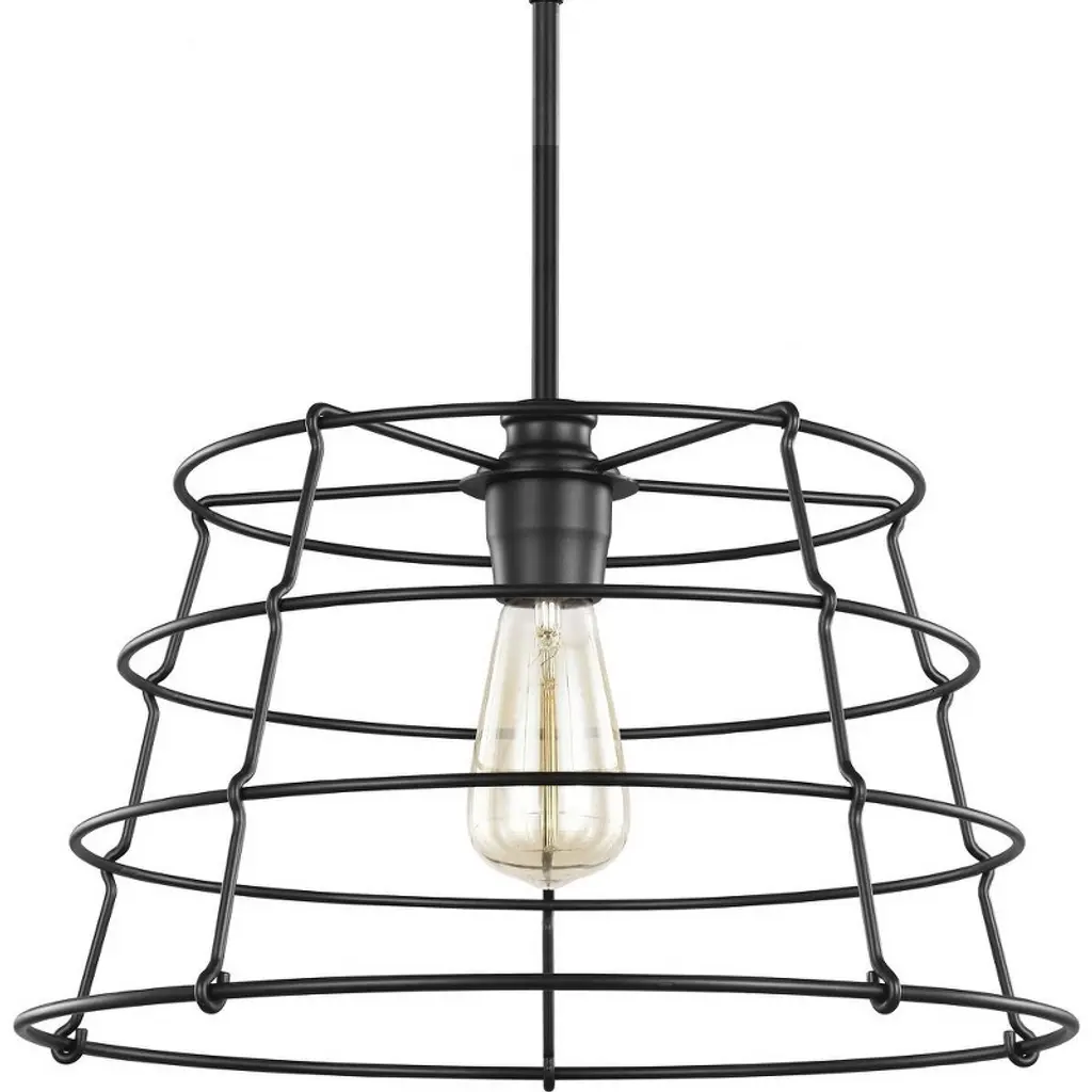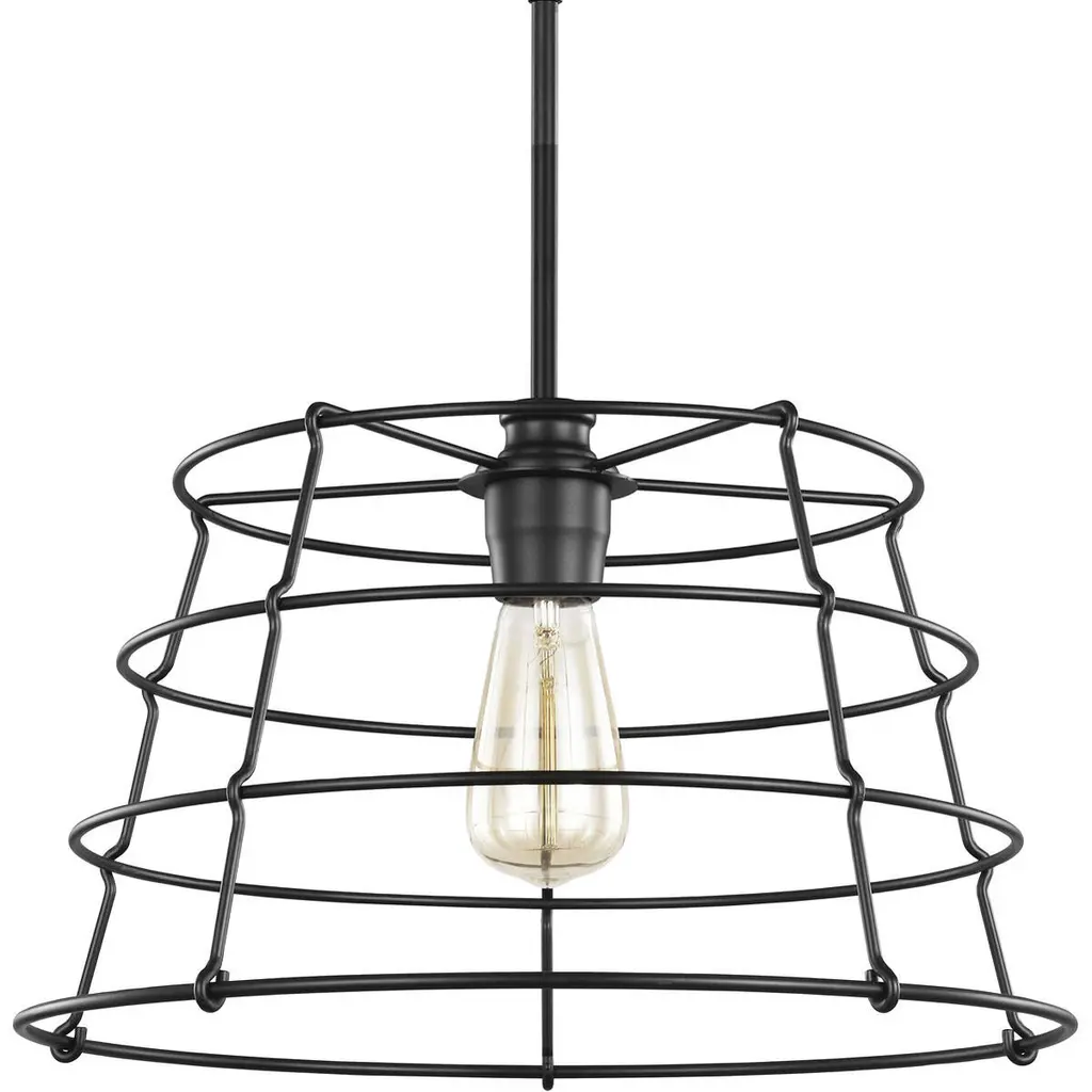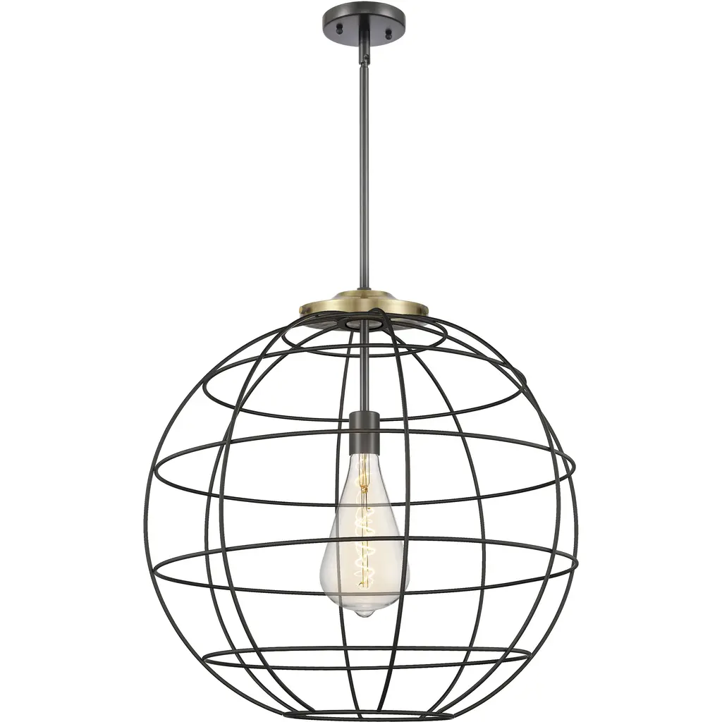 Remix features industrial-inspired pendant options. A Graphite frame is comprised of straps that weave together to create an open cage design. Brushed Nickel accents on the inside add a touch of mixed metal accents. This one-light mini-pendant is part of our Design Series Collections.