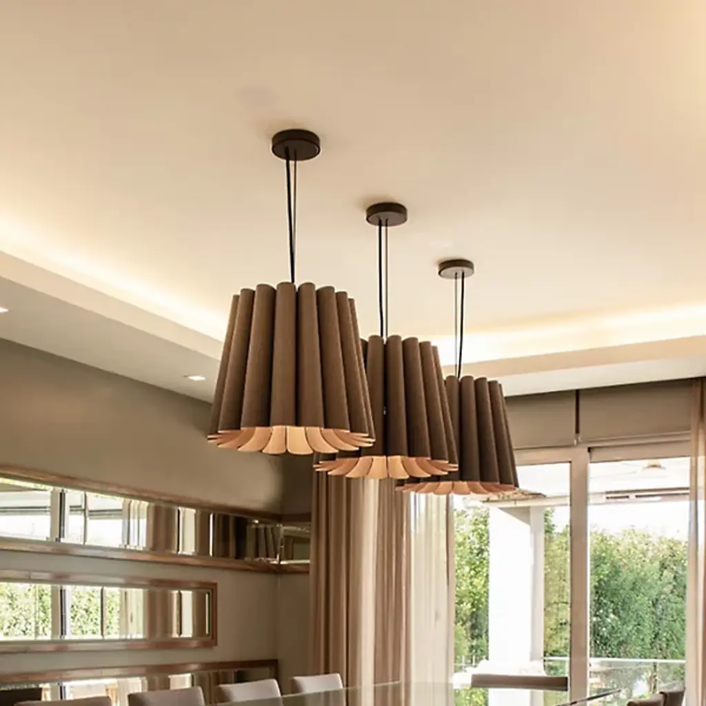 A natural choice for dressing up a modern interior, the Renata Long Drum Pendant by Bruck Lighting is so soft yet crisp-looking, it may appear to be made of precisely tailored fabric. In reality, it is crafted from numerous bent panels of Reconstructed Wood Veneer, with the natural grain revealed through the translucent finish. Part of the Wood Ecological Project (WEP), this pendant is a naturally sophisticated result of inspiration drawn from diverse natural landscapes. Use it to add a soft, elegant touch over a modern dining table.