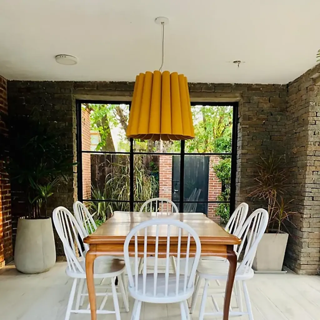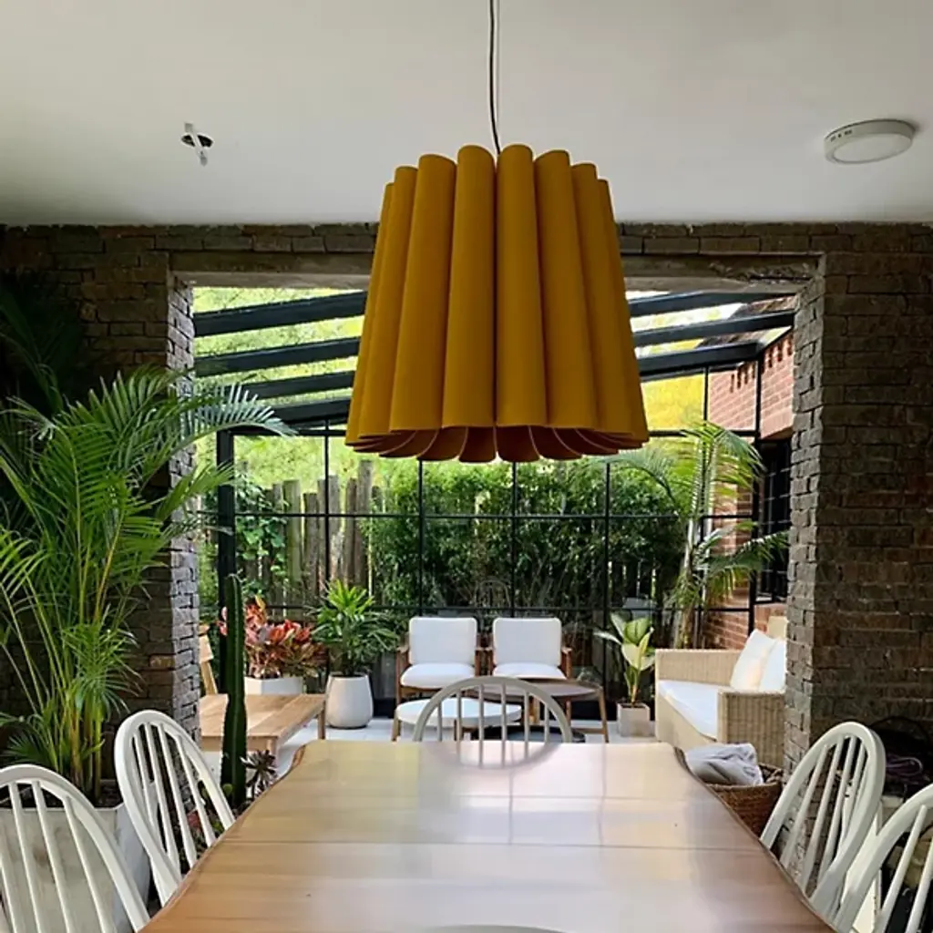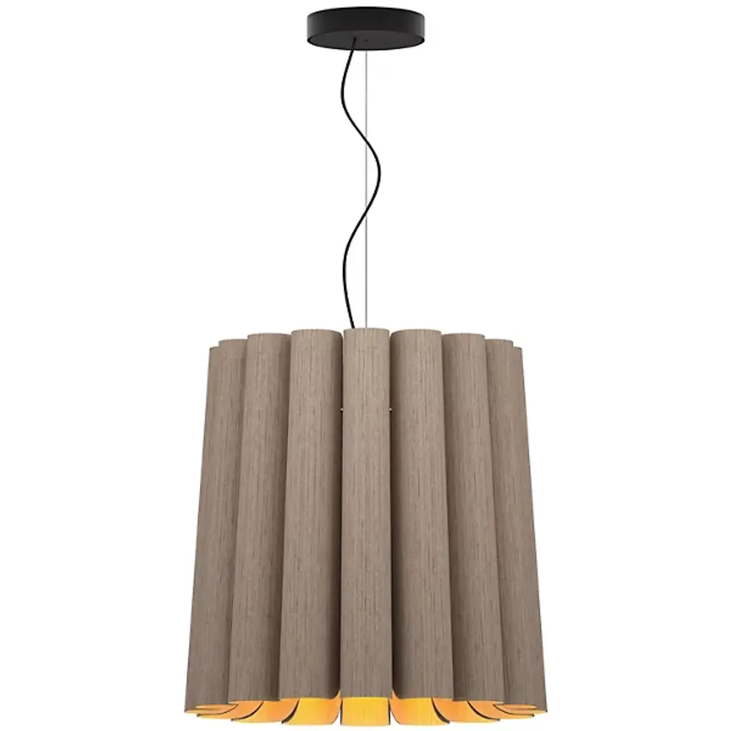 A natural choice for dressing up a modern interior, the Renata Long Drum Pendant by Bruck Lighting is so soft yet crisp-looking, it may appear to be made of precisely tailored fabric. In reality, it is crafted from numerous bent panels of Reconstructed Wood Veneer, with the natural grain revealed through the translucent finish. Part of the Wood Ecological Project (WEP), this pendant is a naturally sophisticated result of inspiration drawn from diverse natural landscapes. Use it to add a soft, elegant touch over a modern dining table.