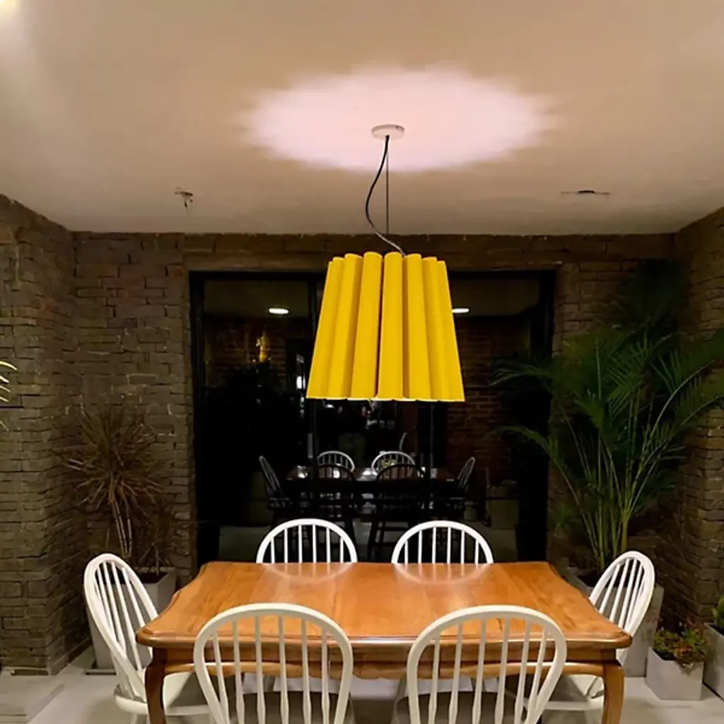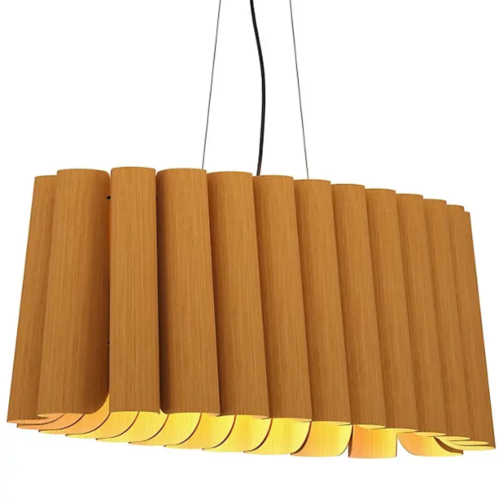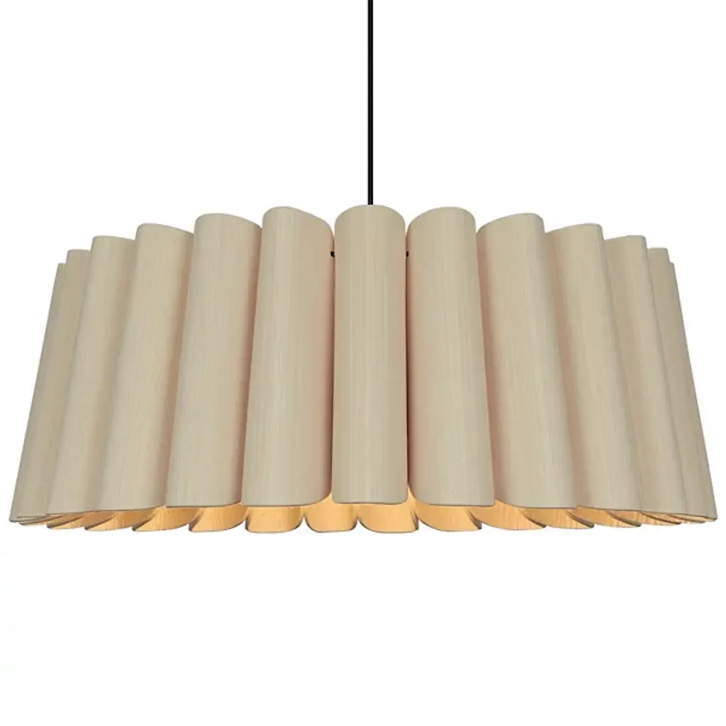 A natural choice for dressing up a modern interior, the Renata Long Drum Pendant by Bruck Lighting is so soft yet crisp-looking, it may appear to be made of precisely tailored fabric. In reality, it is crafted from numerous bent panels of Reconstructed Wood Veneer, with the natural grain revealed through the translucent finish. Part of the Wood Ecological Project (WEP), this pendant is a naturally sophisticated result of inspiration drawn from diverse natural landscapes. Use it to add a soft, elegant touch over a modern dining table.