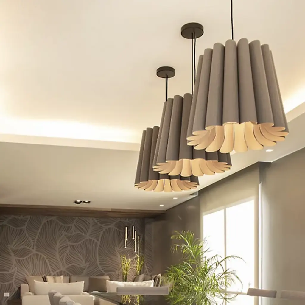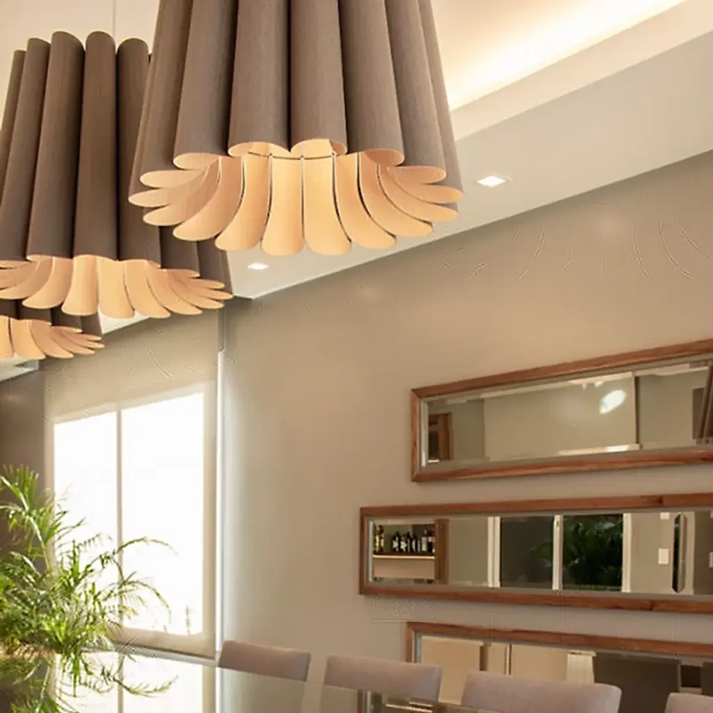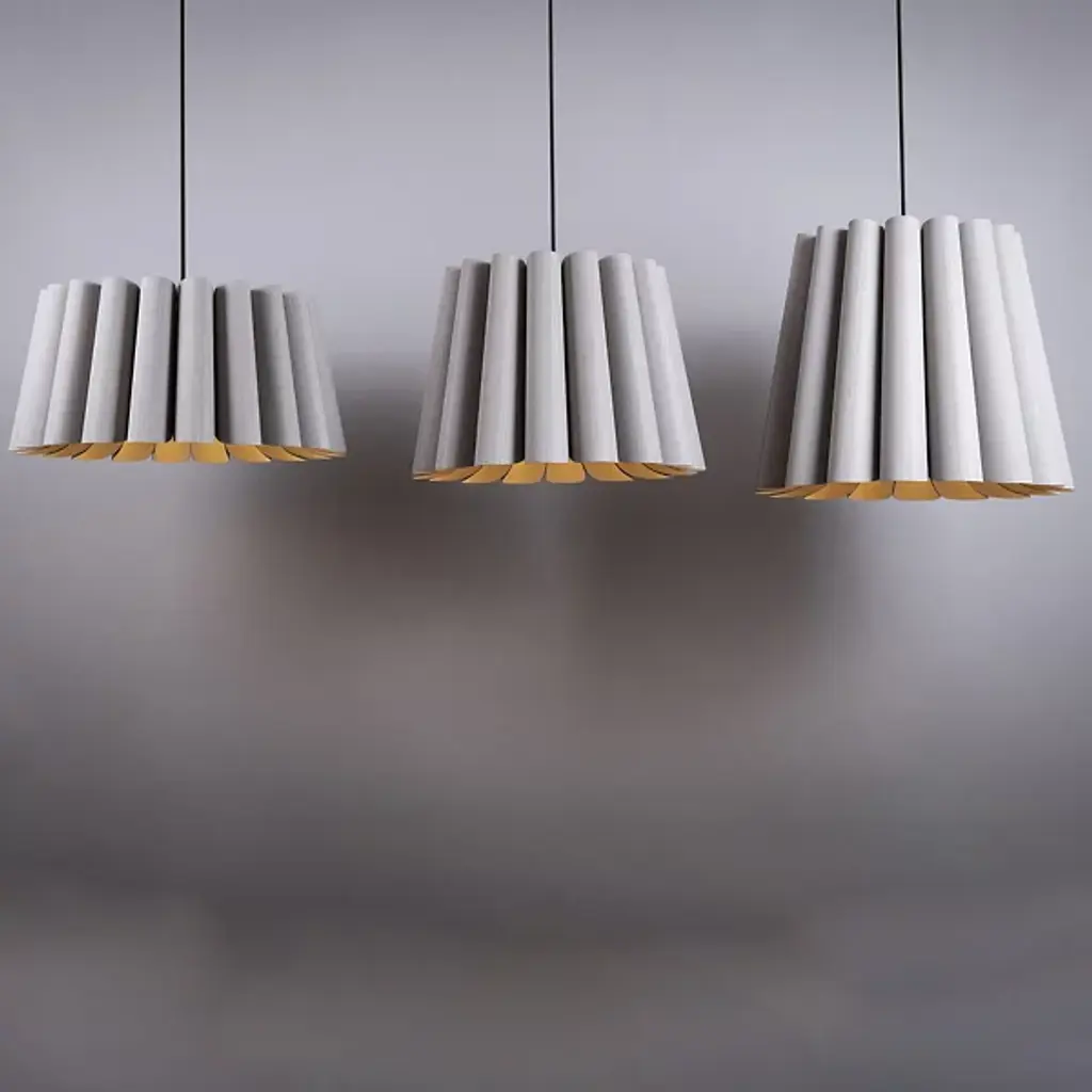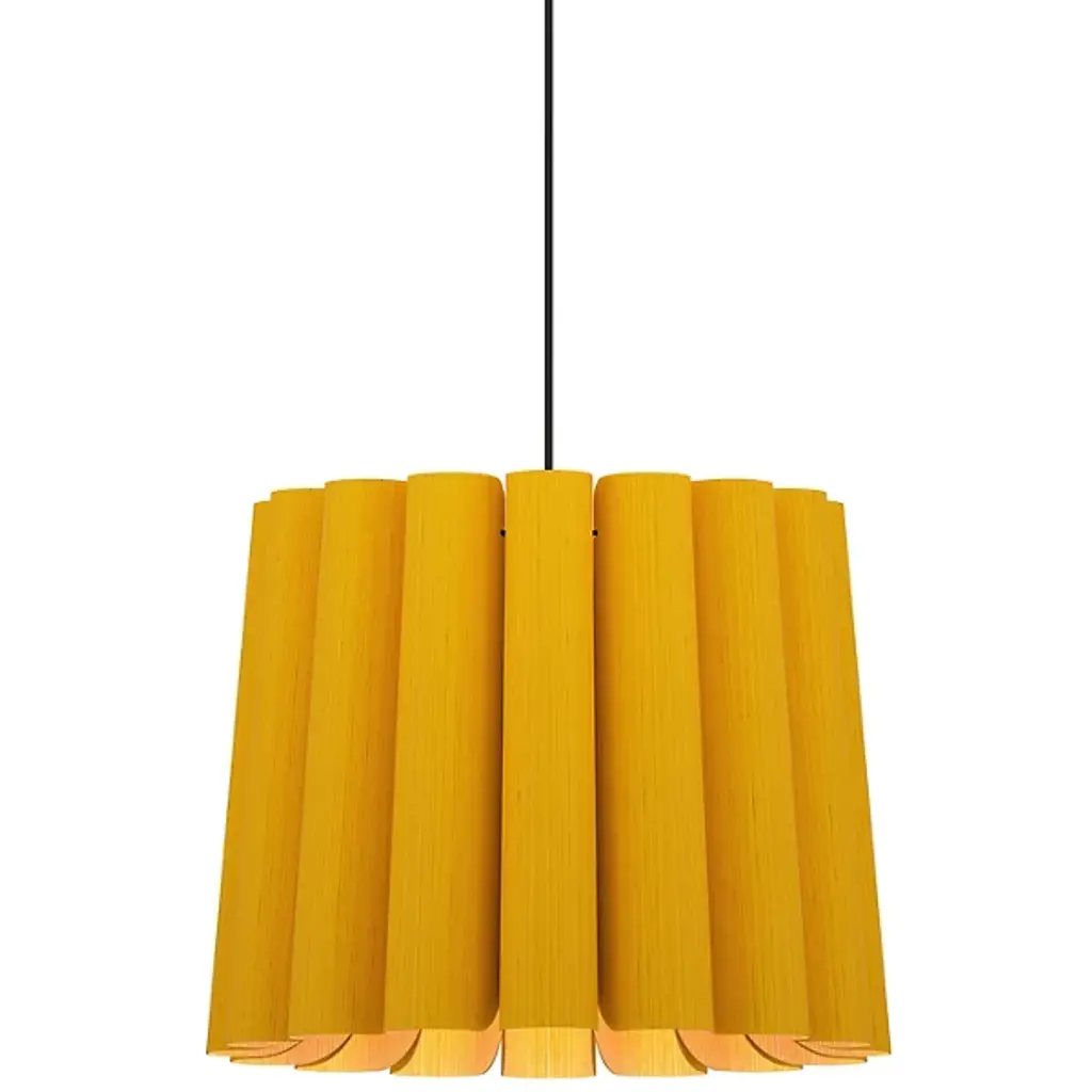 A natural choice for dressing up a modern interior, the Renata Long Drum Pendant by Bruck Lighting is so soft yet crisp-looking, it may appear to be made of precisely tailored fabric. In reality, it is crafted from numerous bent panels of Reconstructed Wood Veneer, with the natural grain revealed through the translucent finish. Part of the Wood Ecological Project (WEP), this pendant is a naturally sophisticated result of inspiration drawn from diverse natural landscapes. Use it to add a soft, elegant touch over a modern dining table.