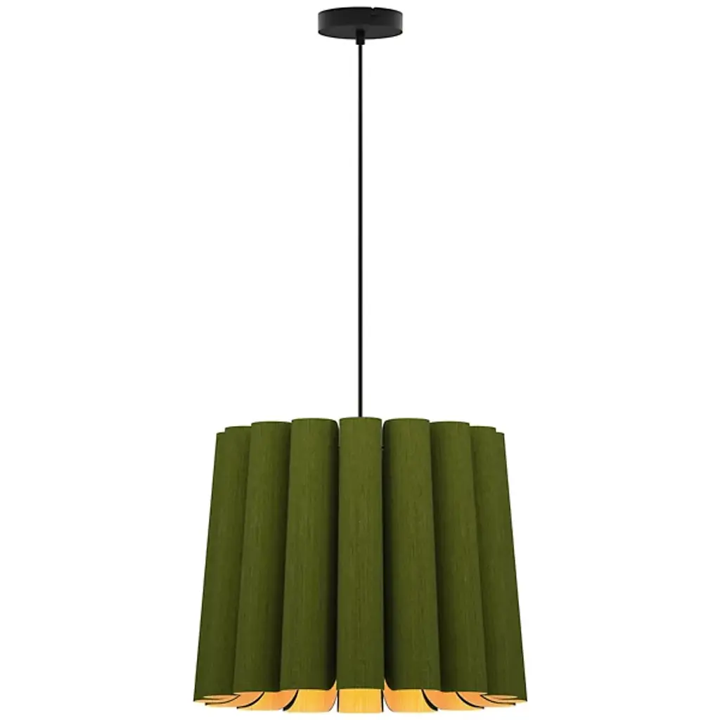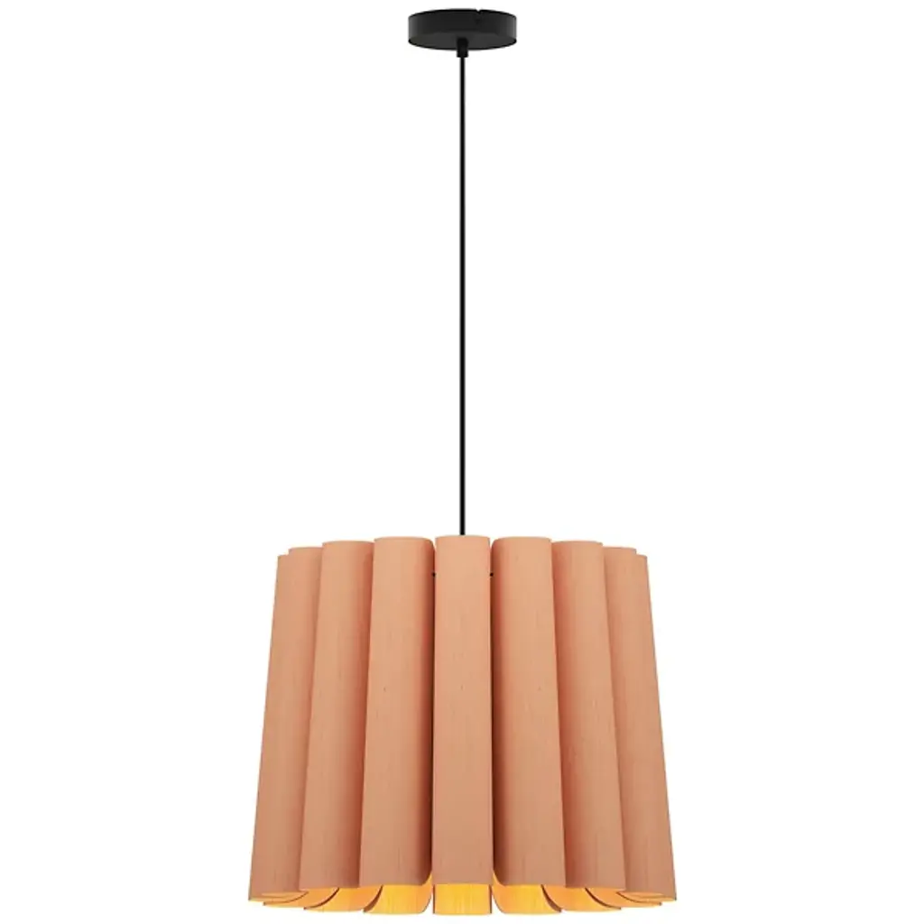 A finely tailored, natural lighting design for modern interiors, the Renata Round Pendant by Bruck Lighting is part of the WEP Light (Wood Ecological Project) Collection. Handcrafted using multiple panels of recycled wood veneer, the panels are arranged in tight curves, creating a subtly flared and pleated-looking shade around the central light source. Over a dining table or kitchen island, this pendant light serves as an organic and refined centerpiece.