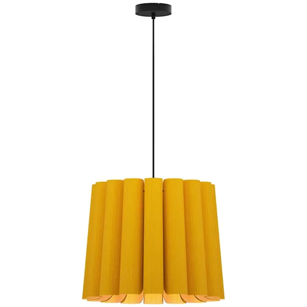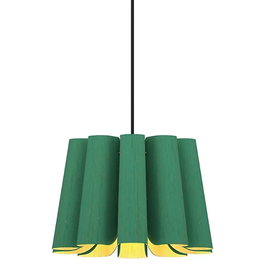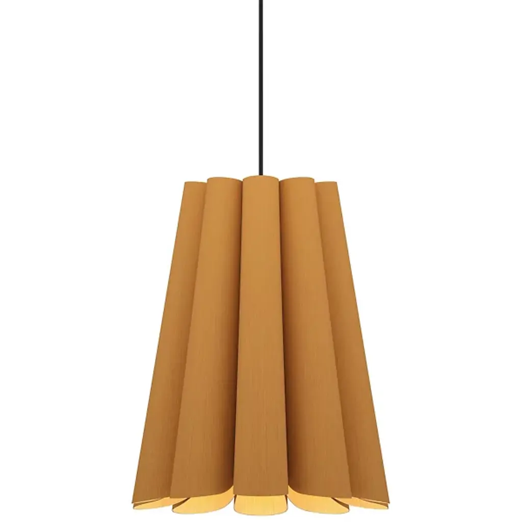 A finely tailored, natural lighting design for modern interiors, the Renata Round Pendant by Bruck Lighting is part of the WEP Light (Wood Ecological Project) Collection. Handcrafted using multiple panels of recycled wood veneer, the panels are arranged in tight curves, creating a subtly flared and pleated-looking shade around the central light source. Over a dining table or kitchen island, this pendant light serves as an organic and refined centerpiece.