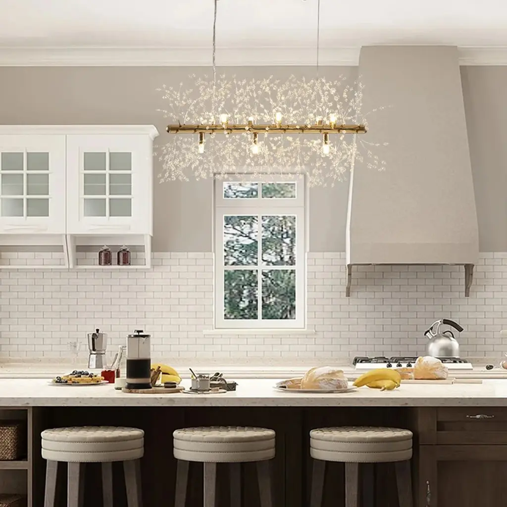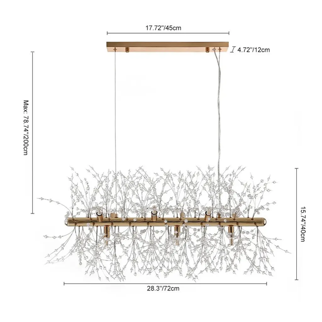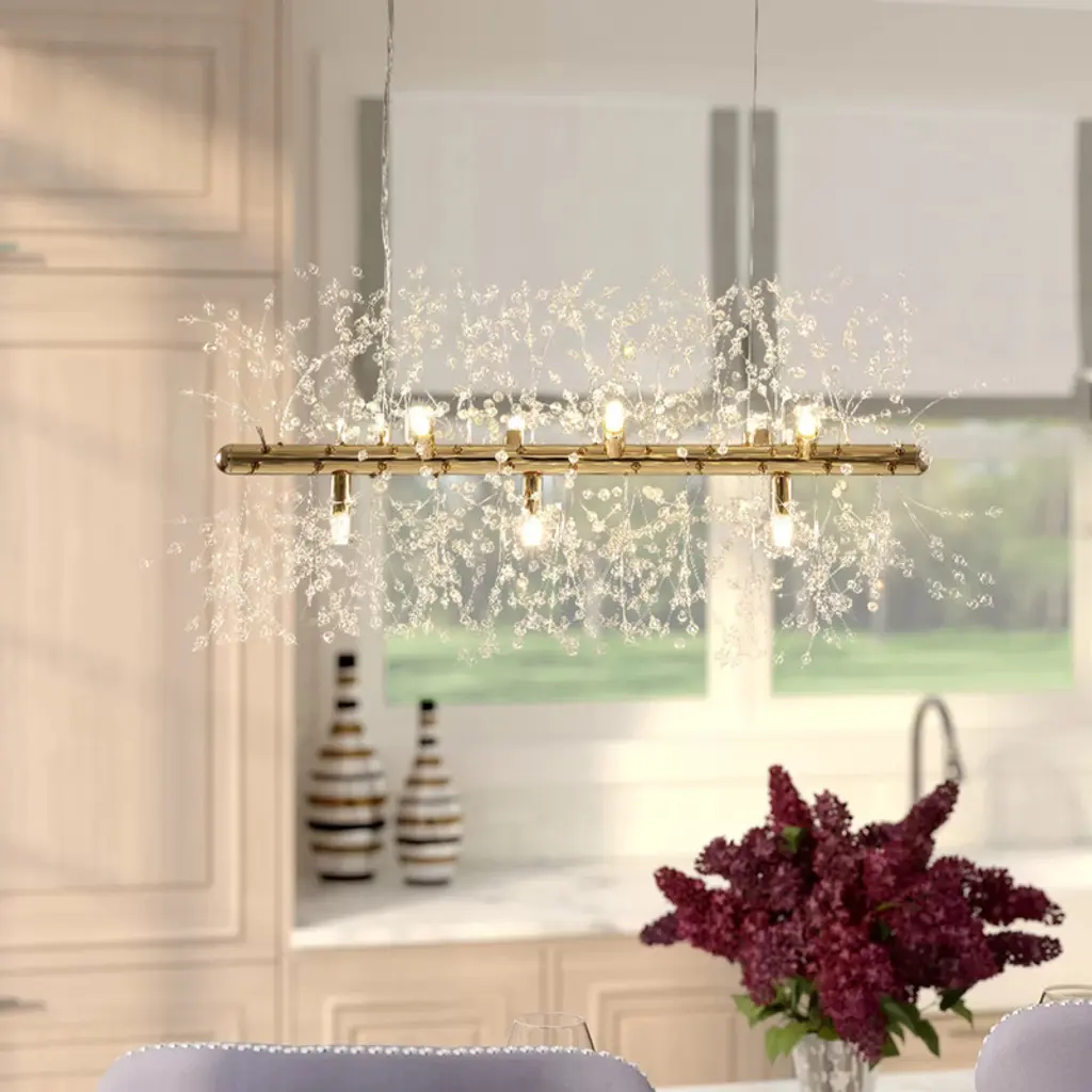 Elevate your kitchen or dining space with this dandelion crystal pendant, featuring a dazzling 9-light sputnik design that mimics a glamorous firework burst. The elongated structure showcases sunburst and starburst elements with a shimmering crystal finish, adding a touch of modern glam to your home. Measuring 15 inches, this eye-catching kitchen island chandelier supports G9 base 60W bulbs (not included) and is fully dimmable for personalized ambiance. All installation hardware is included for a quick and easy setup. Perfect for style-conscious homeowners seeking a bold statement piece that balances function with elegance.