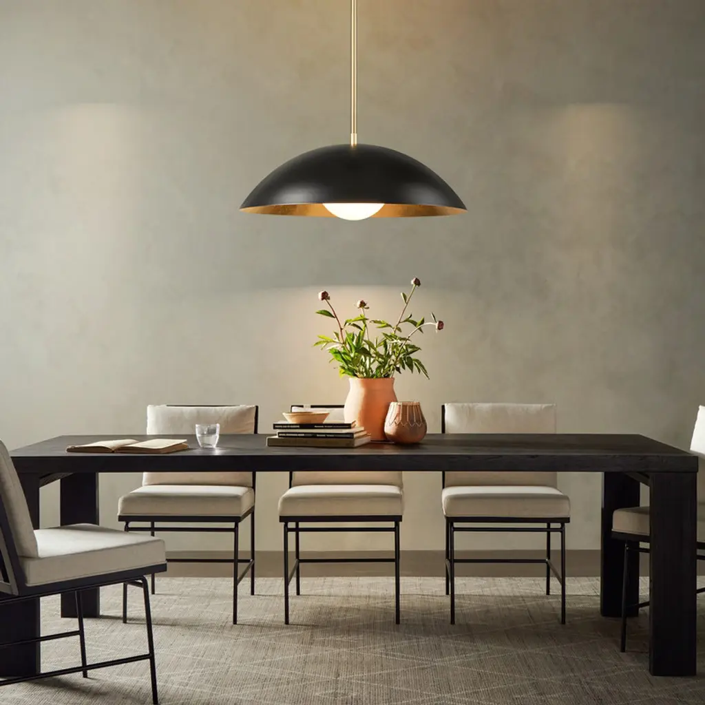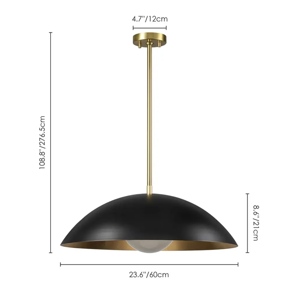 Upgrade your lighting with this oversize 23-inch modern pendant, designed to bring a sleek focal point to kitchens, dining rooms, or entryways. Featuring a clean dome silhouette and distressed gold foile interior, it casts a warm, ambient glow with a touch of industrial charm. The wide shade ensures generous illumination, while the dimmable function lets you adjust brightness to fit any mood. Built for easy installation with all hardware included, this statement piece combines style with function. Compatible with a 60W E26 bulb (not included), it makes a bold impact in minimalist or urban interiors.