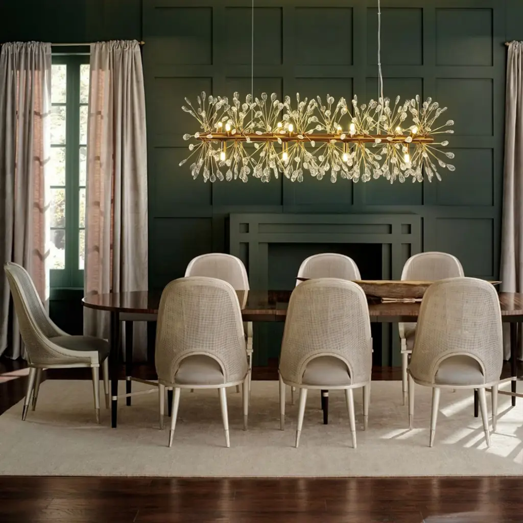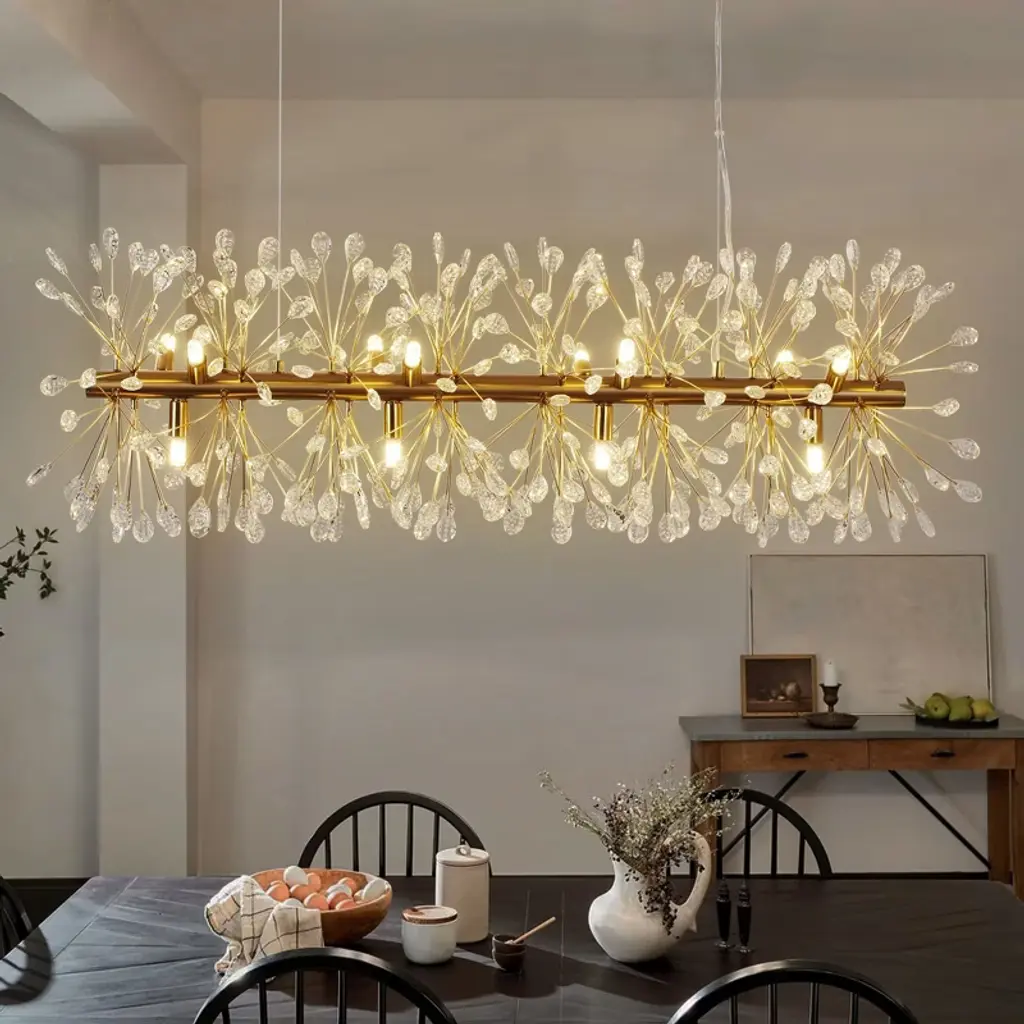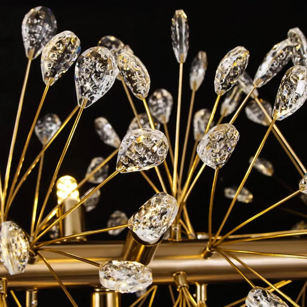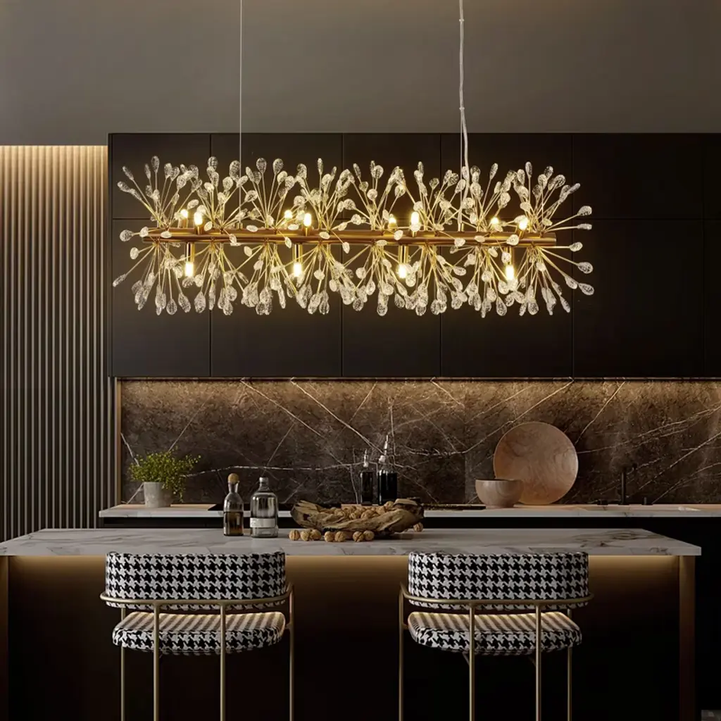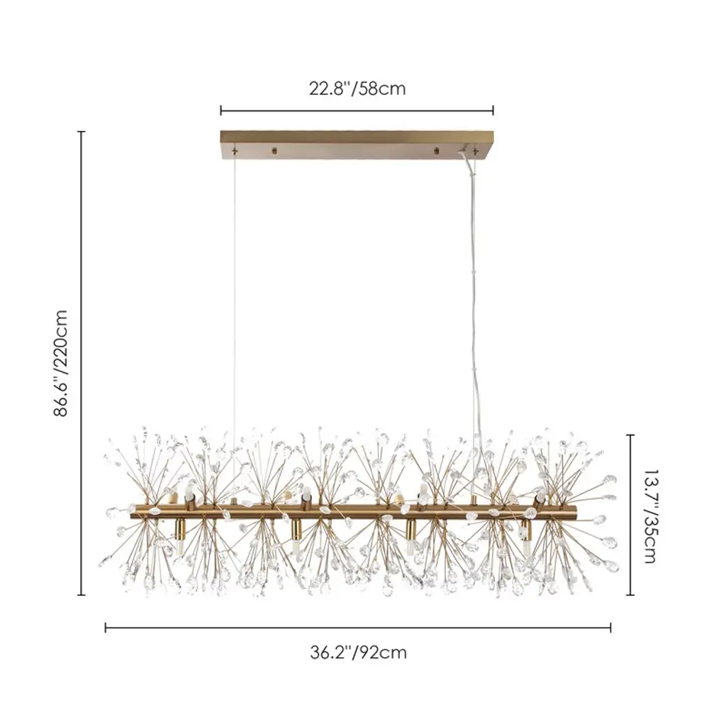 Elevate your kitchen or dining space with this dandelion crystal pendant, featuring a dazzling 12-light sputnik design that mimics a glamorous firework burst. The elongated structure showcases sunburst and starburst elements with a shimmering crystal finish, adding a touch of modern glam to your home. Measuring 35 inches, this eye-catching kitchen island chandelier supports G9 base 60W bulbs (not included) and is fully dimmable for personalized ambiance. All installation hardware is included for a quick and easy setup. Perfect for style-conscious homeowners seeking a bold statement piece that balances function with elegance.
