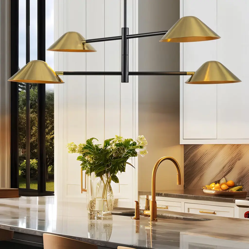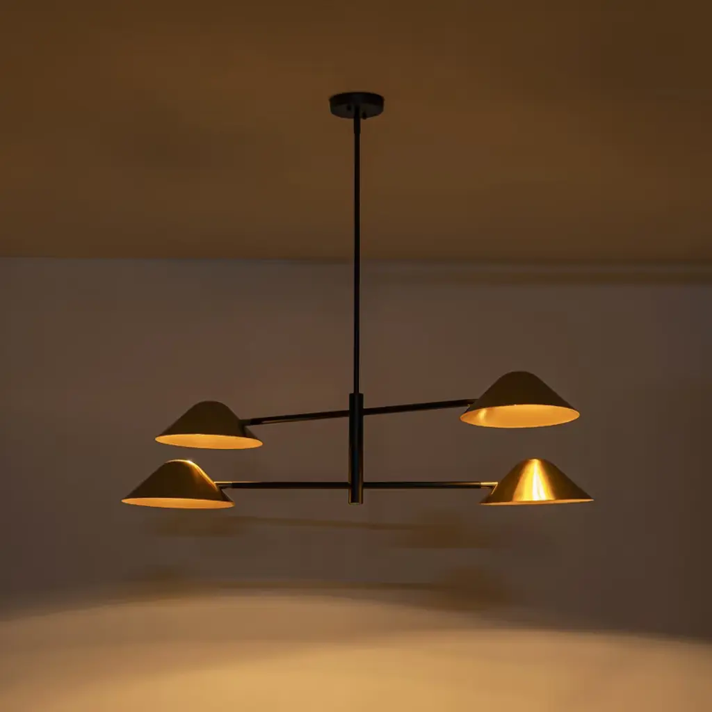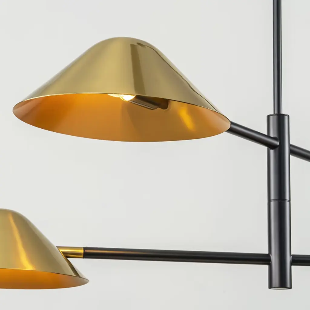 Adding mid-century elegance to your home, this linear sputnik chandelier pendant light features cone-shaped shades and black metal rods, ideal for living rooms or dining areas. Its pivoting arms create a linear or X-shaped silhouette, offering focused illumination. Available in brass and gold finishes, this modern industrial fixture allows easy ambiance customization when paired with a dimmer switch and E12 bulbs (both not included). Perfect for enhancing your space with style and function.