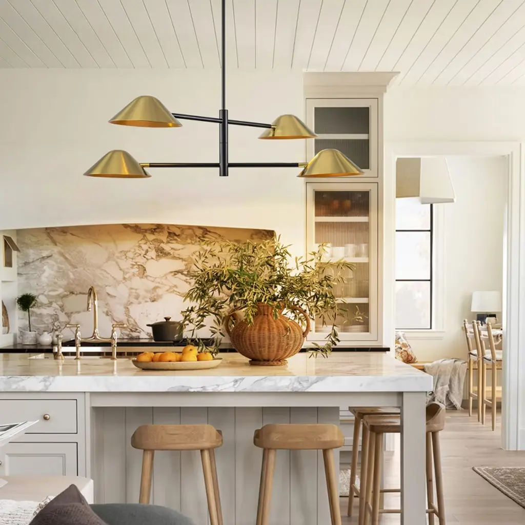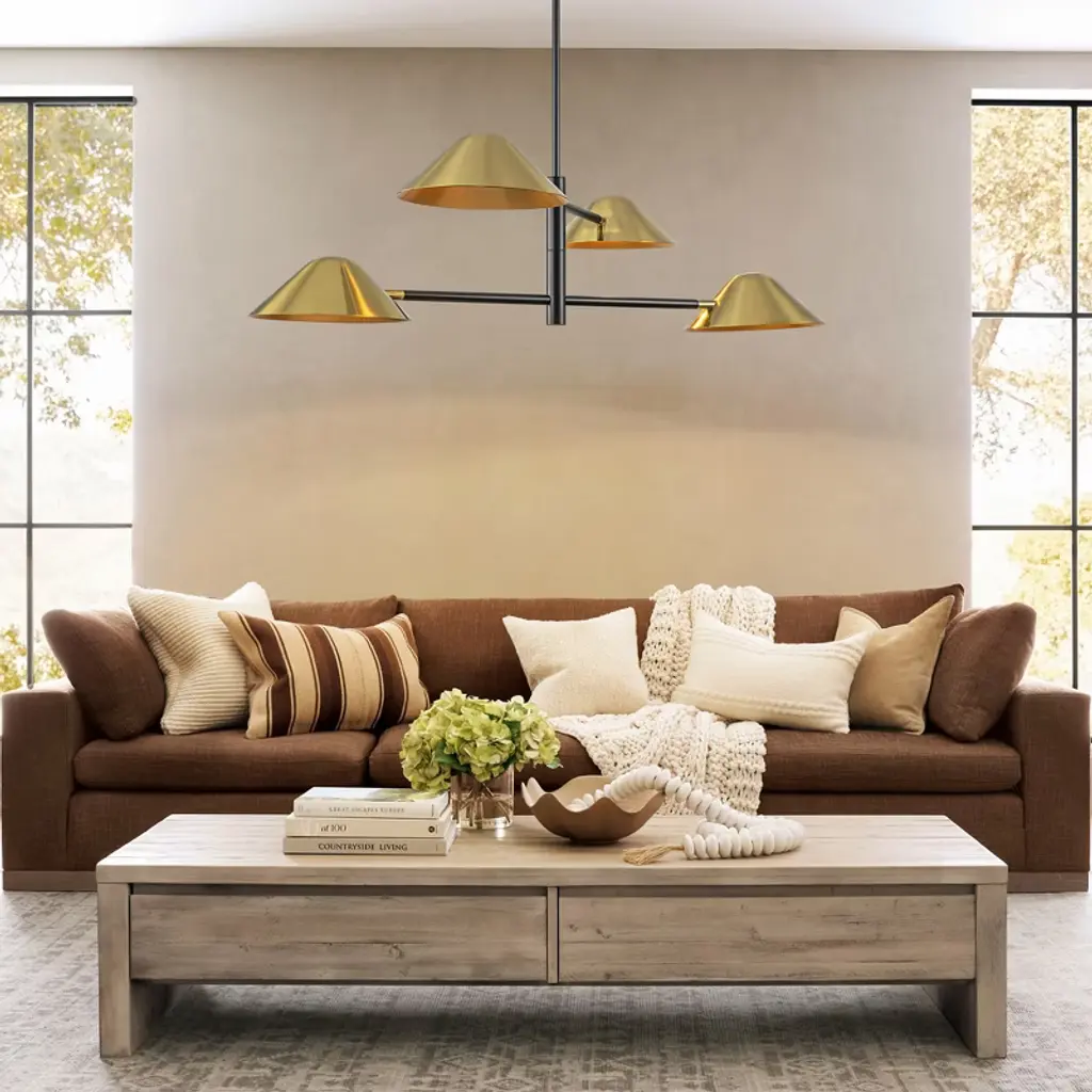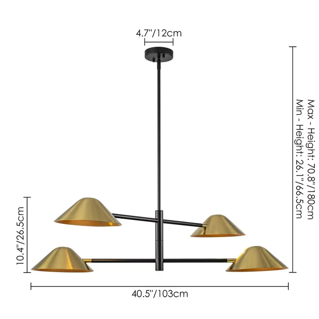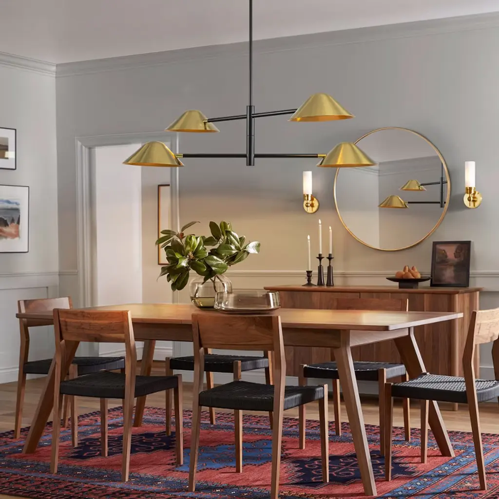 Adding mid-century elegance to your home, this linear sputnik chandelier pendant light features cone-shaped shades and black metal rods, ideal for living rooms or dining areas. Its pivoting arms create a linear or X-shaped silhouette, offering focused illumination. Available in brass and gold finishes, this modern industrial fixture allows easy ambiance customization when paired with a dimmer switch and E12 bulbs (both not included). Perfect for enhancing your space with style and function.