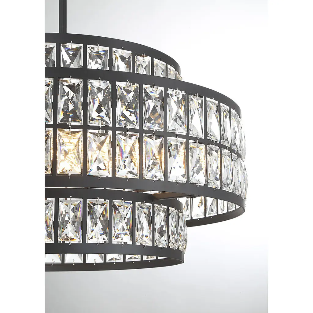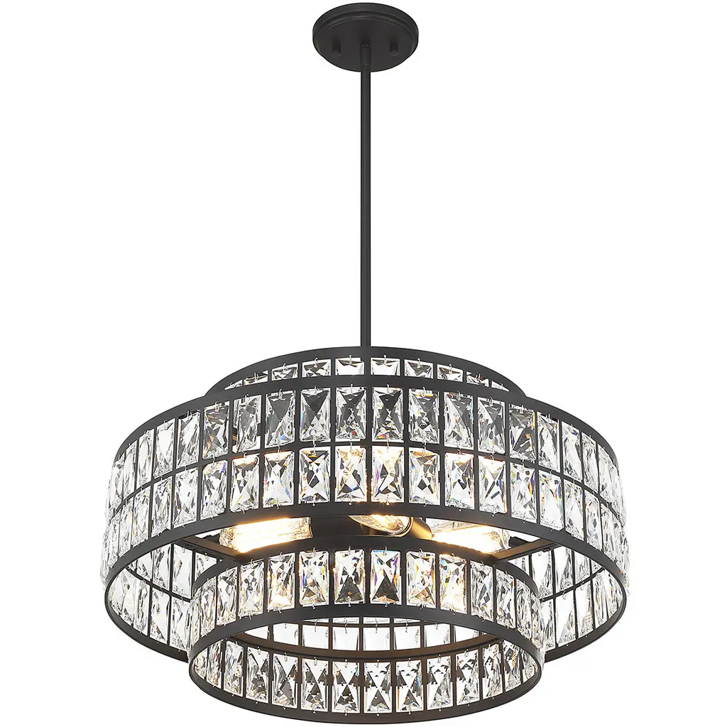 It is often said that lighting is the jewelry of the home and the Savoy House Renzo 4-light pendant is a perfect example of this saying. Faceted clear crystal decorates the two layers of shades, which overlap in an intriguing way and are finished in matte black. Renzo is 22" in width and has an adjustable height ranging from 12.5" to 66". Comes with four 12" downrods and one 6" downrod. It uses 4 standard size bulbs of up to 60 watts per bulb (bulbs not included).