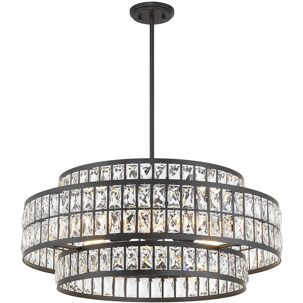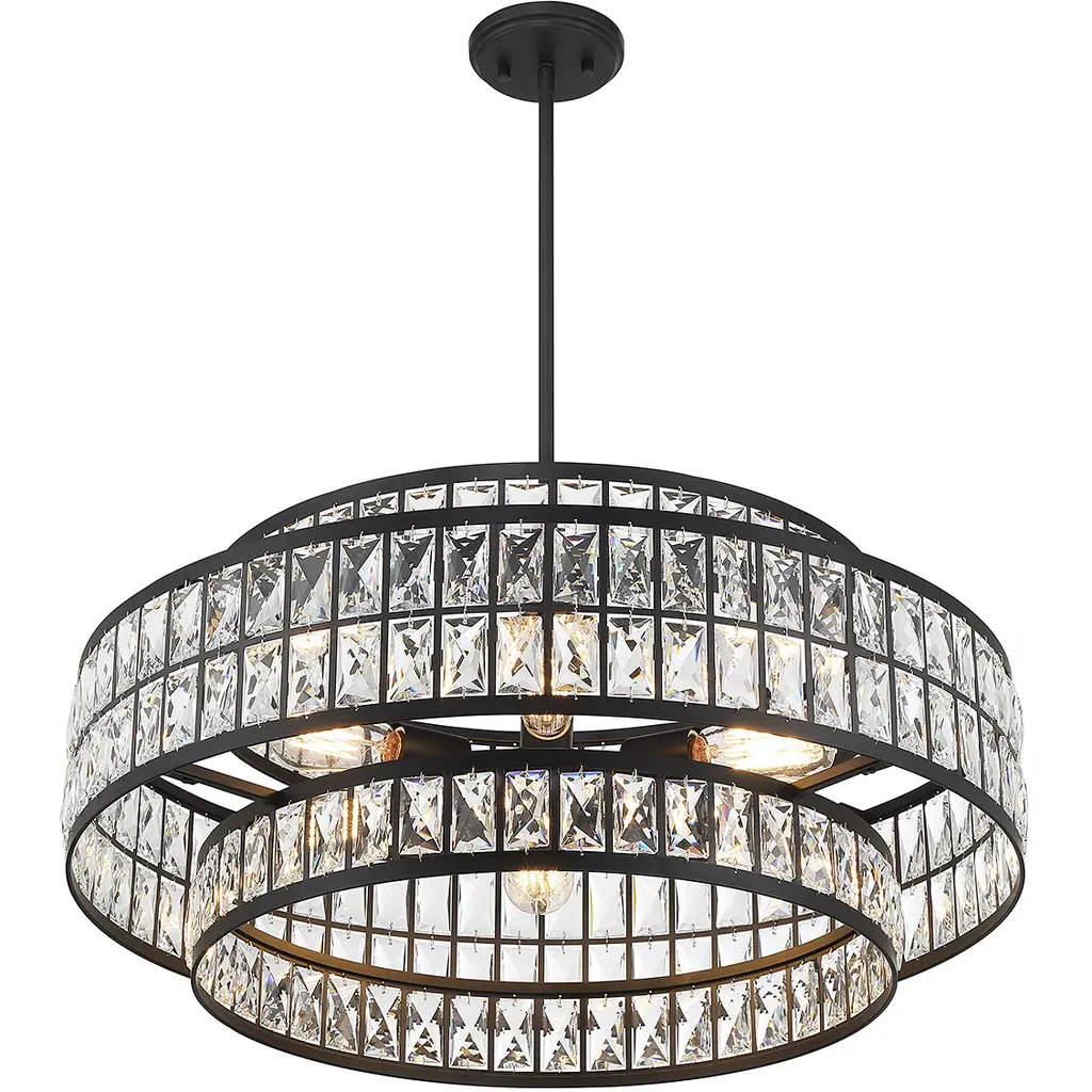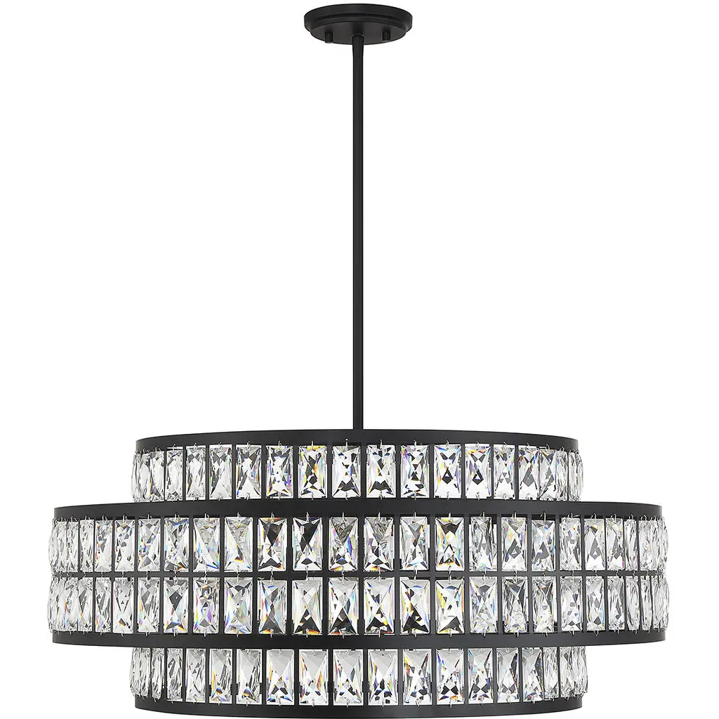 It is often said that lighting is the jewelry of the home and the Savoy House Renzo 6-light pendant is a perfect example of this saying. Faceted clear crystal decorates the two layers of shades, which overlap in an intriguing way and are finished in matte black. Renzo is 28" in width and has an adjustable height ranging from 12.5" to 66". Comes with four 12" downrods and one 6" downrod. It uses 6 standard size bulbs of up to 60 watts per bulb (bulbs not included).
