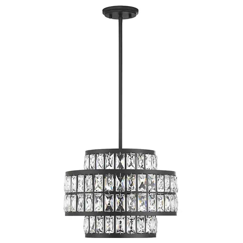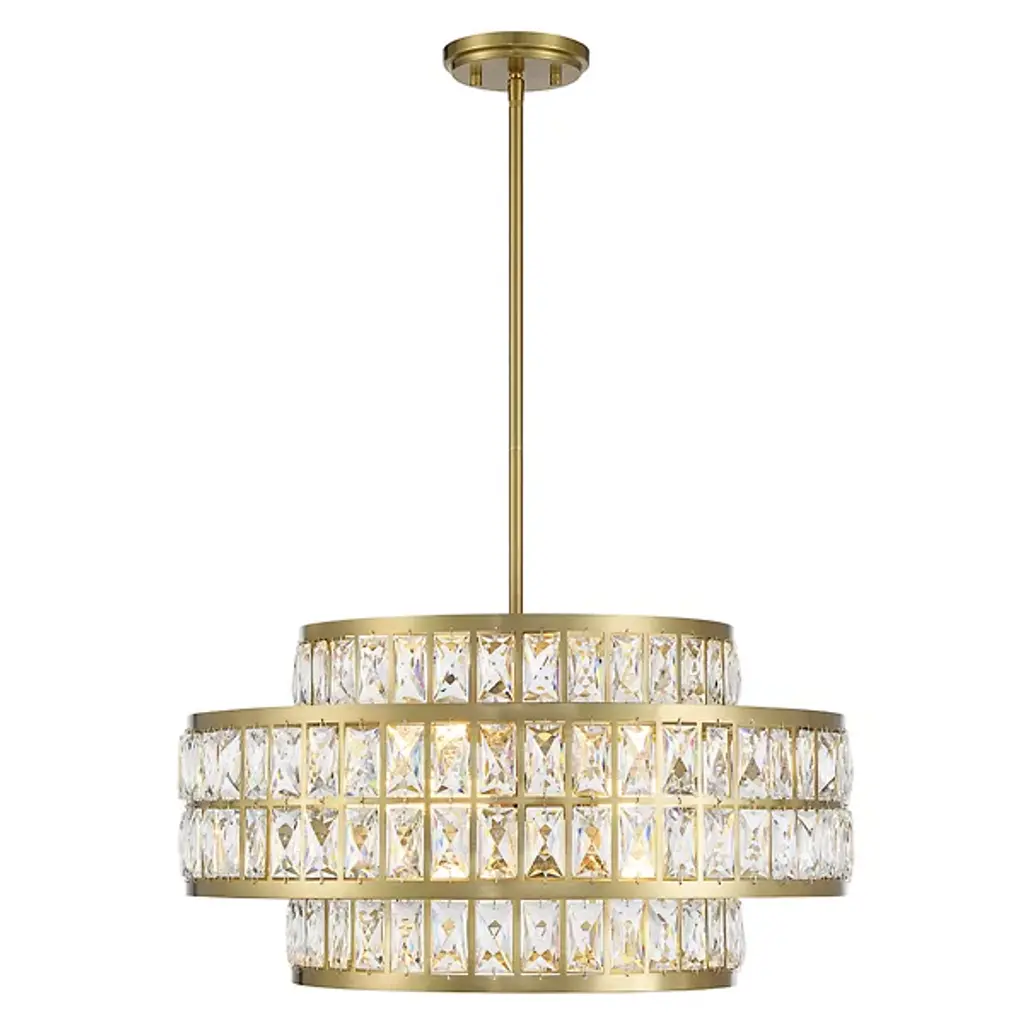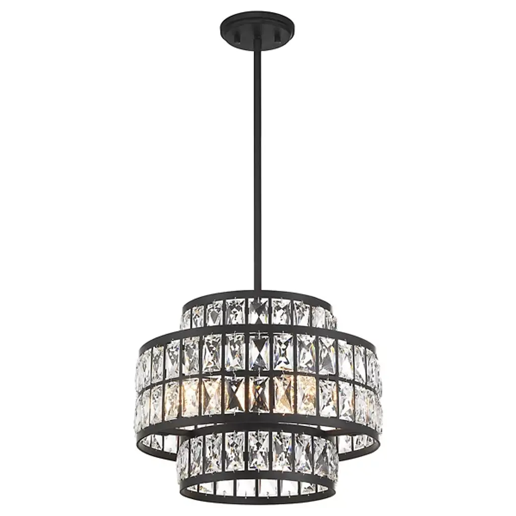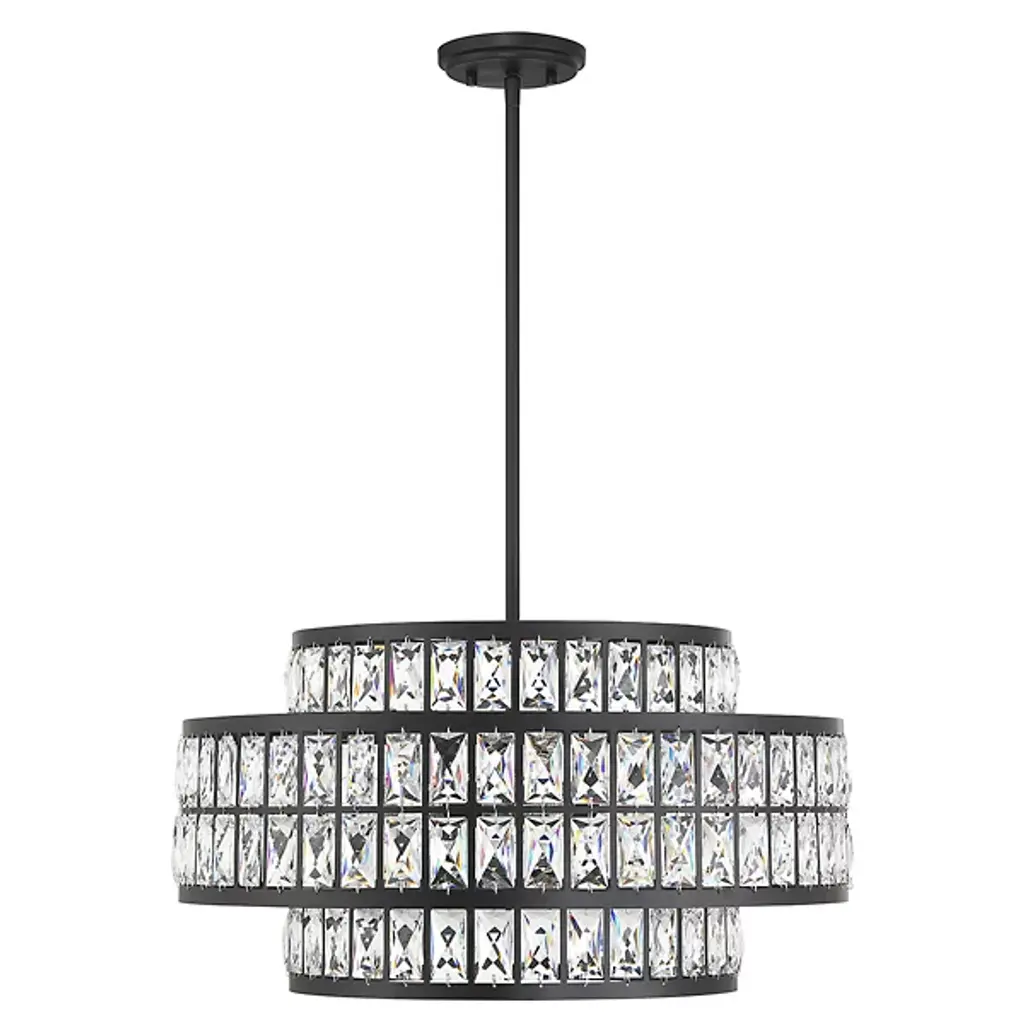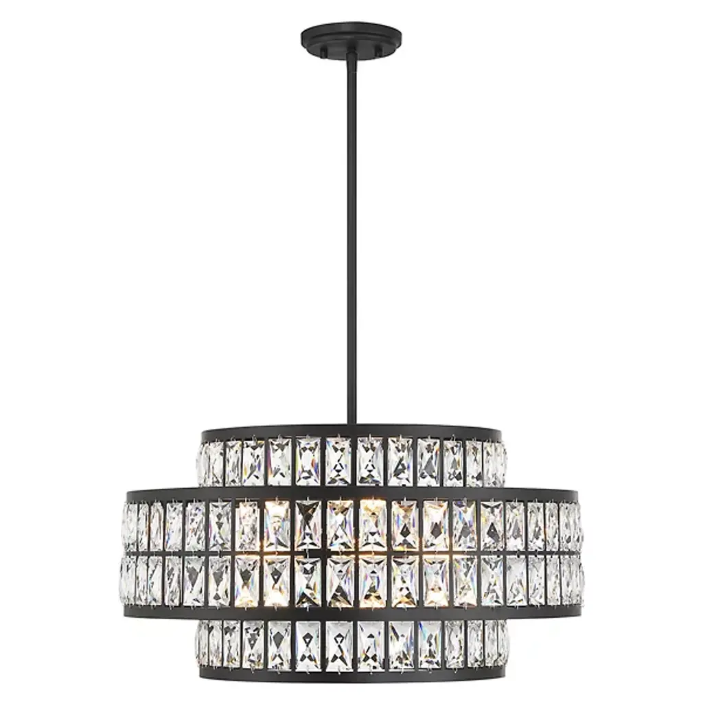 Light up your space with the glittering brilliance of the Renzo Pendant from Savoy House. Faceted clear crystal tiles adorn the two-layered metal drum shades, overlapping to create an intriguing silhouette. The sparkling rings of jewel-like crystal encircle the inner lamps, providing stellar illumination. The central lamping casts a direct downlight through the crystal tiles, sending dazzling refractions to the sides. The pendant features smooth metal and adds a glamorous, rich accompaniment to ceilings.