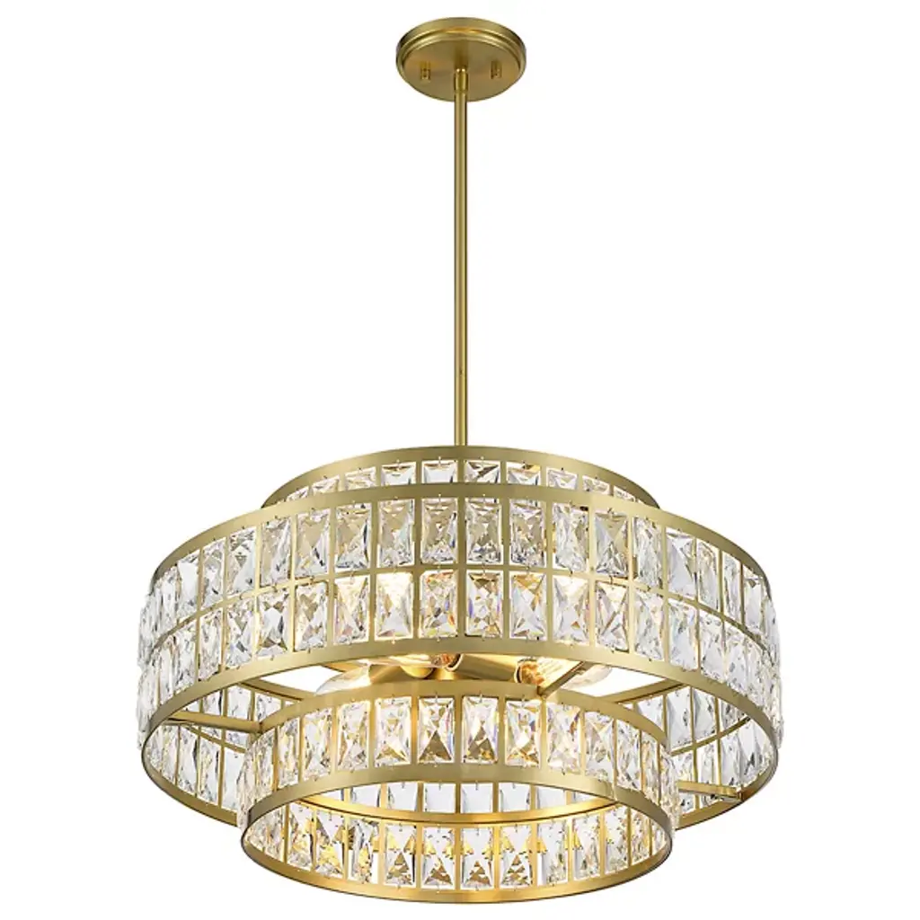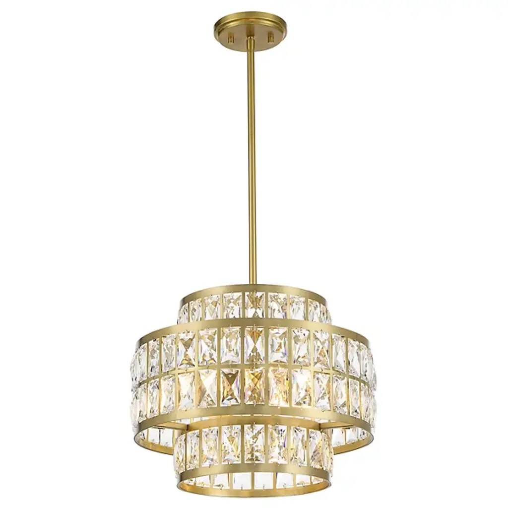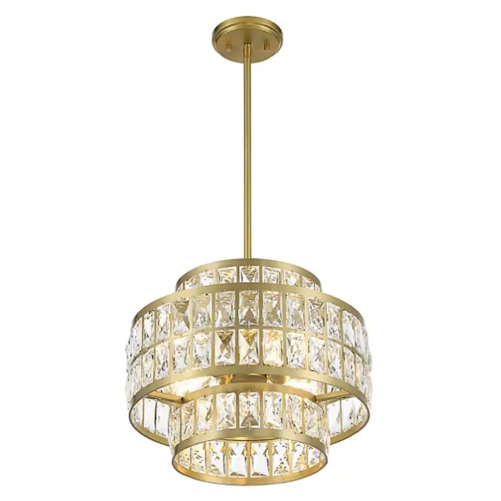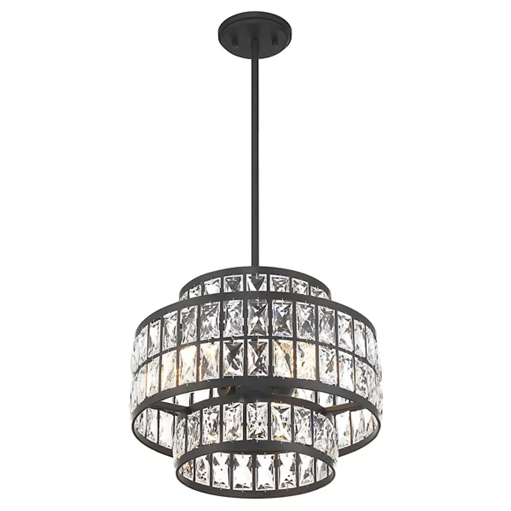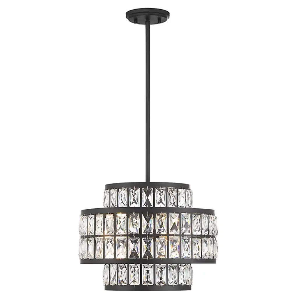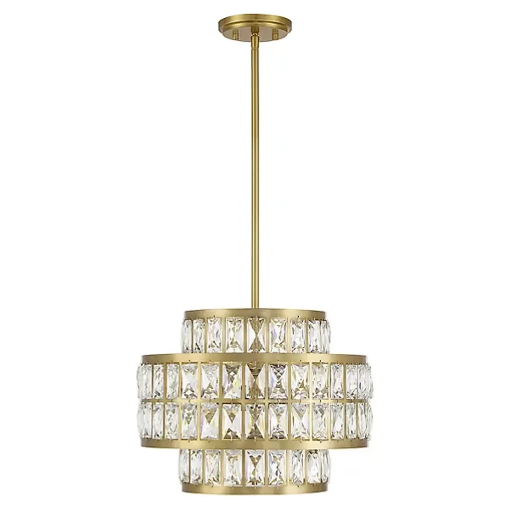 Light up your space with the glittering brilliance of the Renzo Pendant from Savoy House. Faceted clear crystal tiles adorn the two-layered metal drum shades, overlapping to create an intriguing silhouette. The sparkling rings of jewel-like crystal encircle the inner lamps, providing stellar illumination. The central lamping casts a direct downlight through the crystal tiles, sending dazzling refractions to the sides. The pendant features smooth metal and adds a glamorous, rich accompaniment to ceilings.