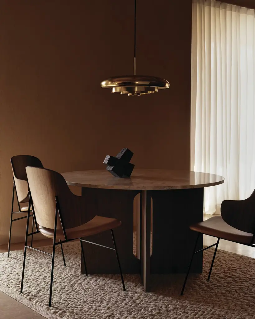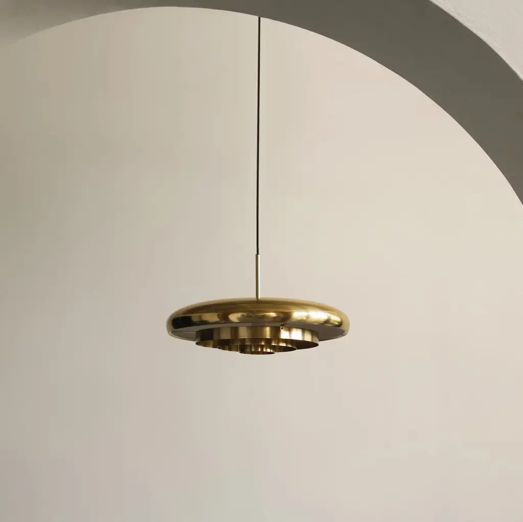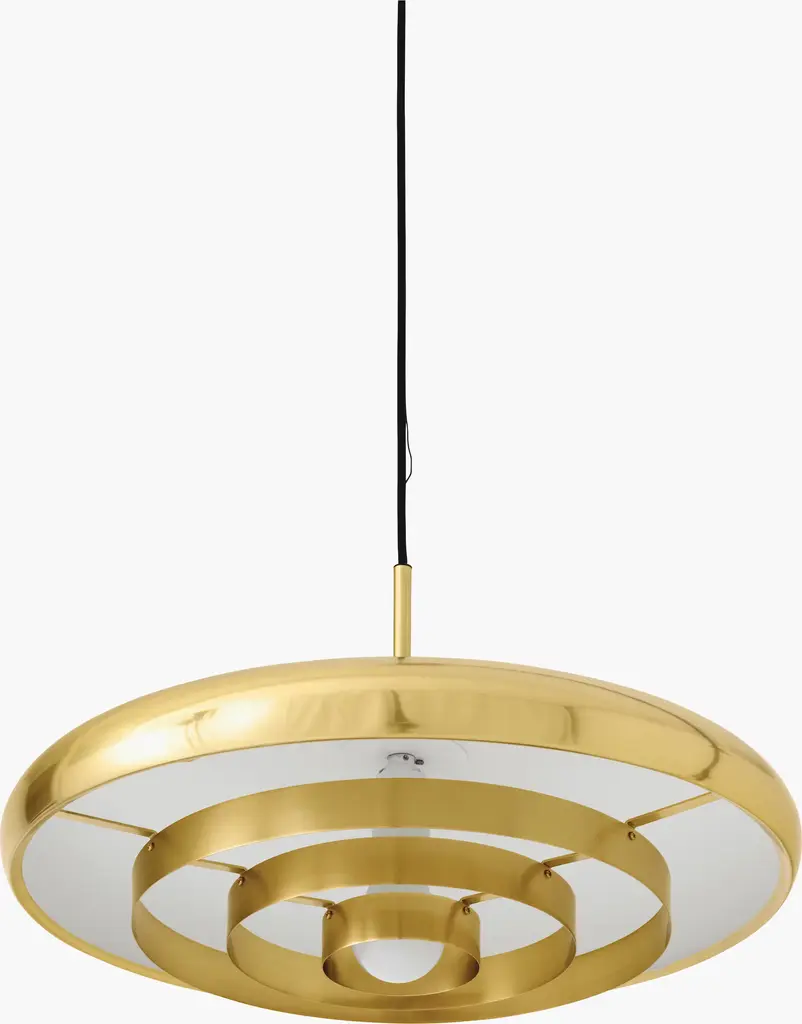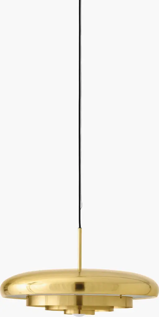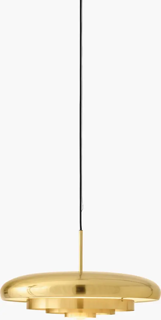The Resonant Pendant (1950s) is a midcentury modern piece whose simple yet striking form continues to resonate. Designed by Alf Svensson and Yngvar Sandström, this pendant adds elegance above a dining table or kitchen island, or in an entryway. Four concentric, polished brass shades are nested to provide glare-free downward illumination. Its shiny surface reflects and reverberates light and shape across the room. Bulb (not included): LED or incandescent 60W E26. ETL listed. Made in China.