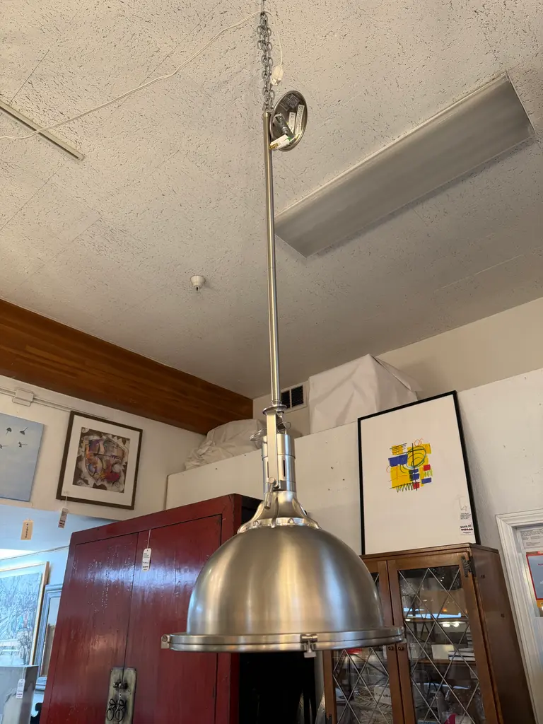 Design Plus Gallery presents the Harmon Pendant from Restoration Hardware. The pendant is a streamlined take on industrial lighting, with exposed thumbscrews and a pivoting yoke collar. A frosted glass diffuser softens the light within. Is in good condiotn with minimal wear for its usage. *Note: Identical Pendant May Also Be Available