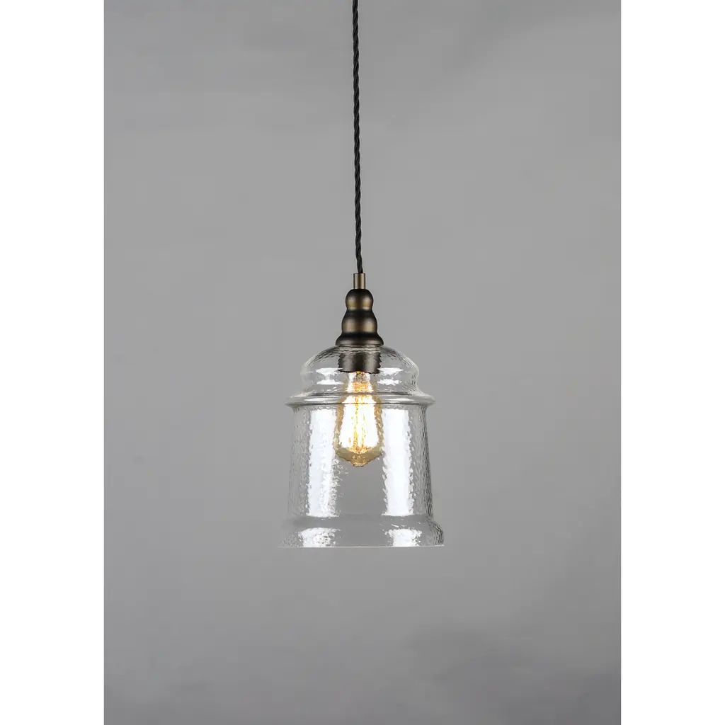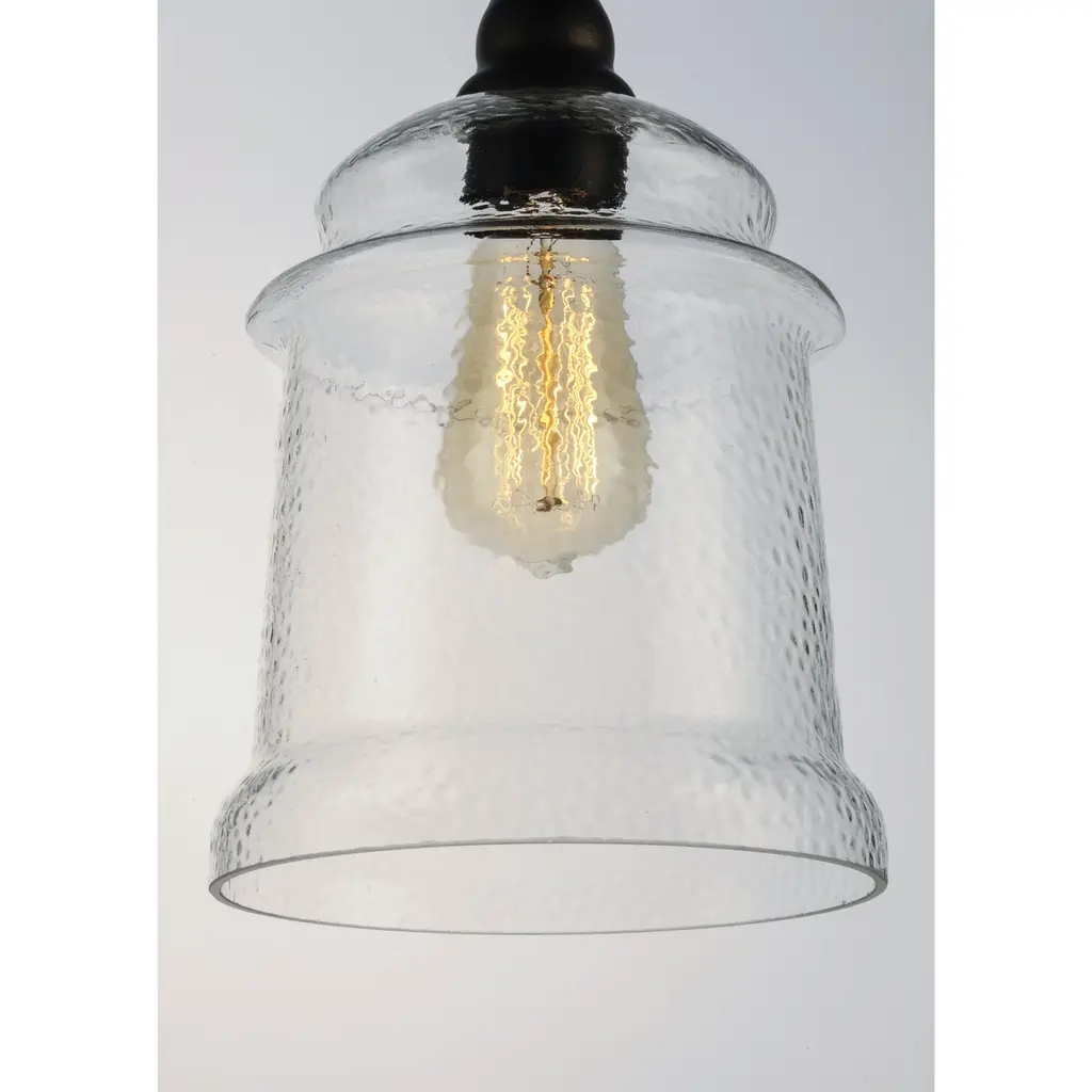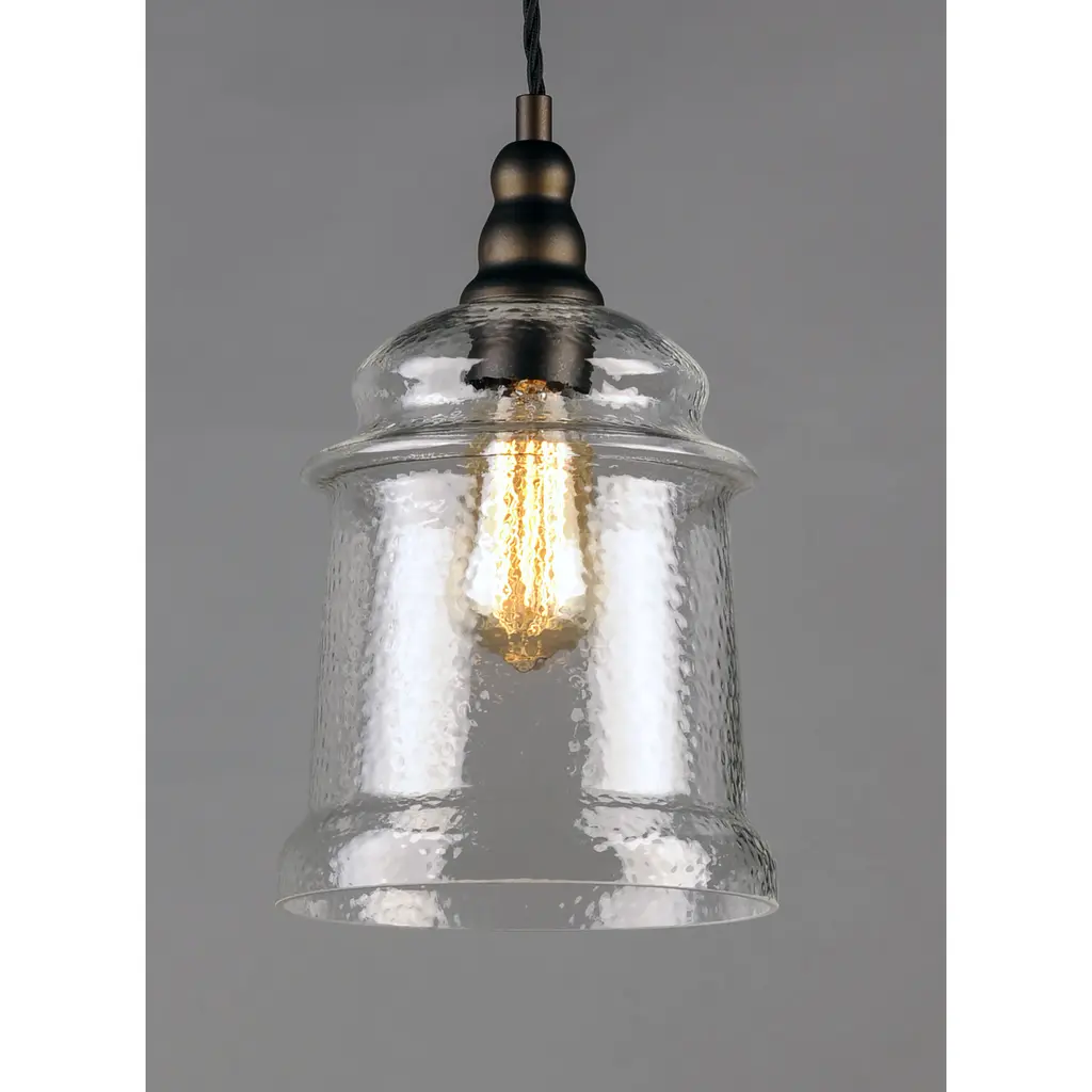 Metal frames of Oil Rubbed Bronze are draped with a twisted fabric wire for that authentic detail. Clear Hammered glass shades suspend from the twisted wire reminiscent of yesteryear. The restoration style of this collection lives on forever.