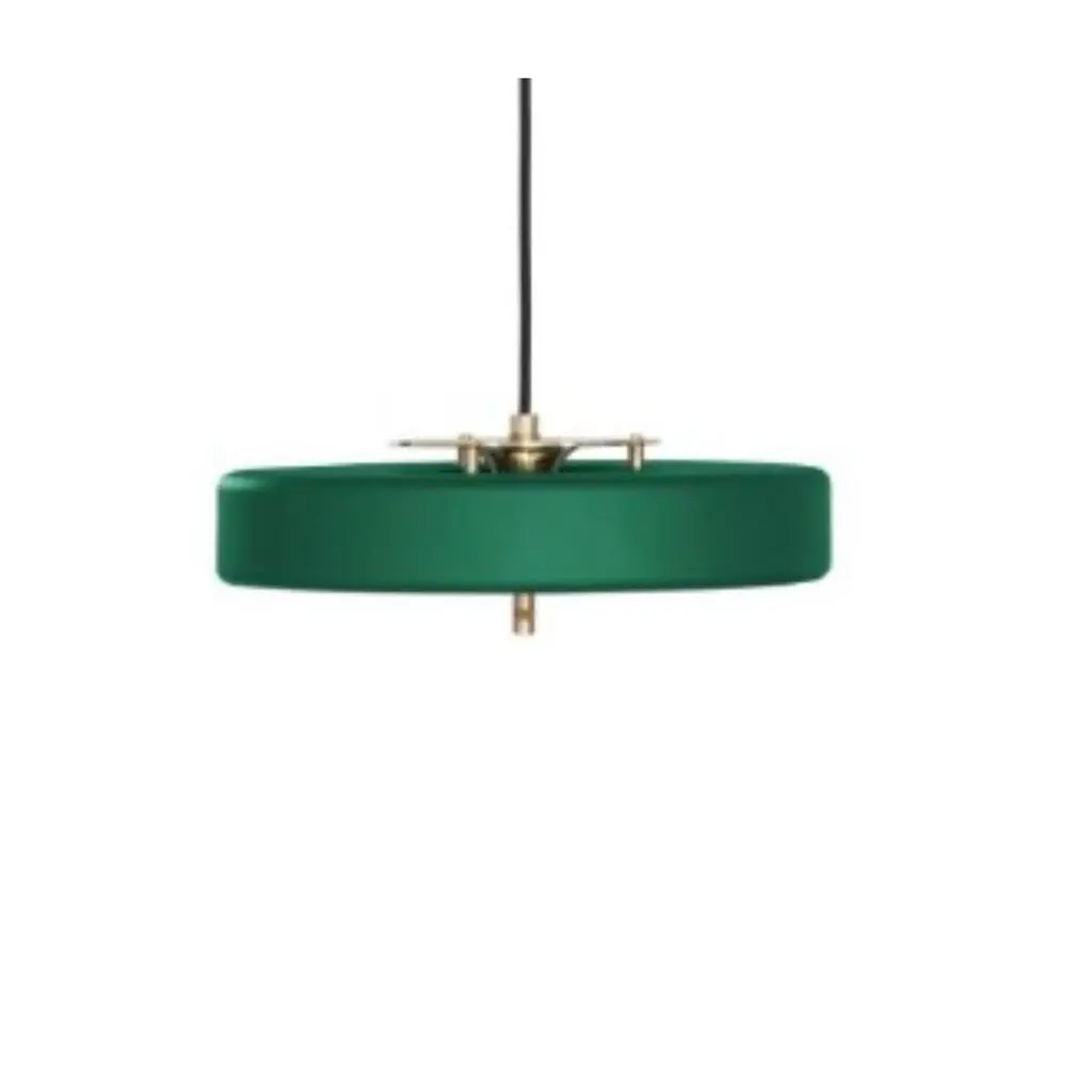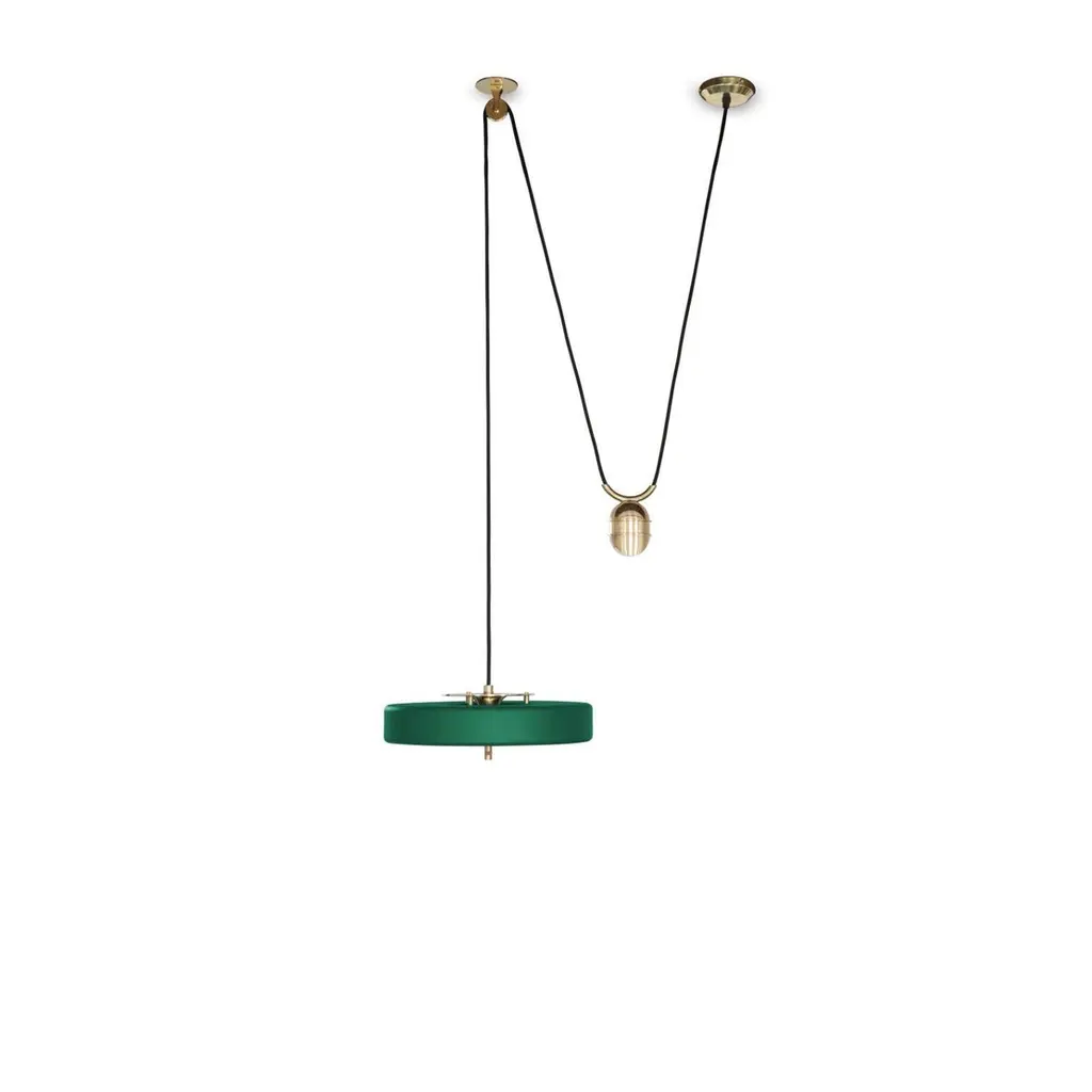 Revolve rise and fall pendant light - Brushed brass - Green by Bert FrankDimensions: 30 x 35 x 11 cm, small lamp 7.6 cmMaterials: Brass, steel When Adam Yeats and Robbie Llewellyn founded Bert Frank in 2013 it was a meeting of minds and the start of a collaborative creative partnership with engineering at the core.Both men share a love of design and deep respect for the heritage of British engineering. Both wanted to create high-end products that would Stand the test of time and fly in the face of throwaway consumerism. The partnership has resulted in award-winning lighting and accessories that fuse the integrity of the small-scale workshop with timeless aesthetics reimagined for today.The two men work closely together from concept to end product. Robbie’s imagination and occasional flights of fancy are informed by Adam’s understanding of engineering principles and fabrication techniques. Equally, Adam's designs are often the starting point for a collection. In that sense Bert Frank is a true creative collaboration. As a result, every designed is honed to perfection, every detail carefully considered.