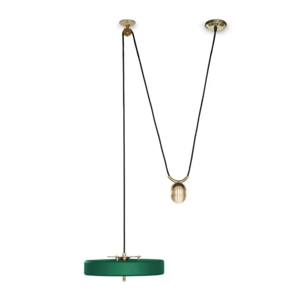 Revolve rise and fall pendant light, polished brass, green by Bert FrankDimensions: 30 x 35 x 11 cm, small lamp: 7.6 cmMaterials: Brass, steel When Adam Yeats and Robbie Llewellyn founded Bert Frank in 2013 it was a meeting of minds and the start of a collaborative creative partnership with engineering at the core.Both men share a love of design and deep respect for the heritage of British engineering. Both wanted to create high-end products that would Stand the test of time and fly in the face of throwaway consumerism. The partnership has resulted in award-winning lighting and accessories that fuse the integrity of the small-scale workshop with timeless aesthetics reimagined for today.The two men work closely together from concept to end product. Robbie’s imagination and occasional flights of fancy are informed by Adam’s understanding of engineering principles and fabrication techniques. Equally, Adam's designs are often the starting point for a collection. In that sense Bert Frank is a true creative collaboration. As a result, every designed is honed to perfection, every detail carefully considered.