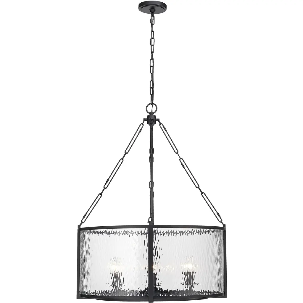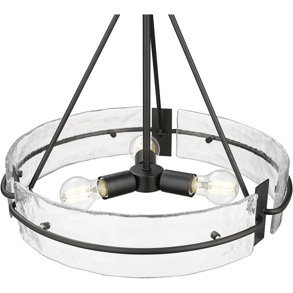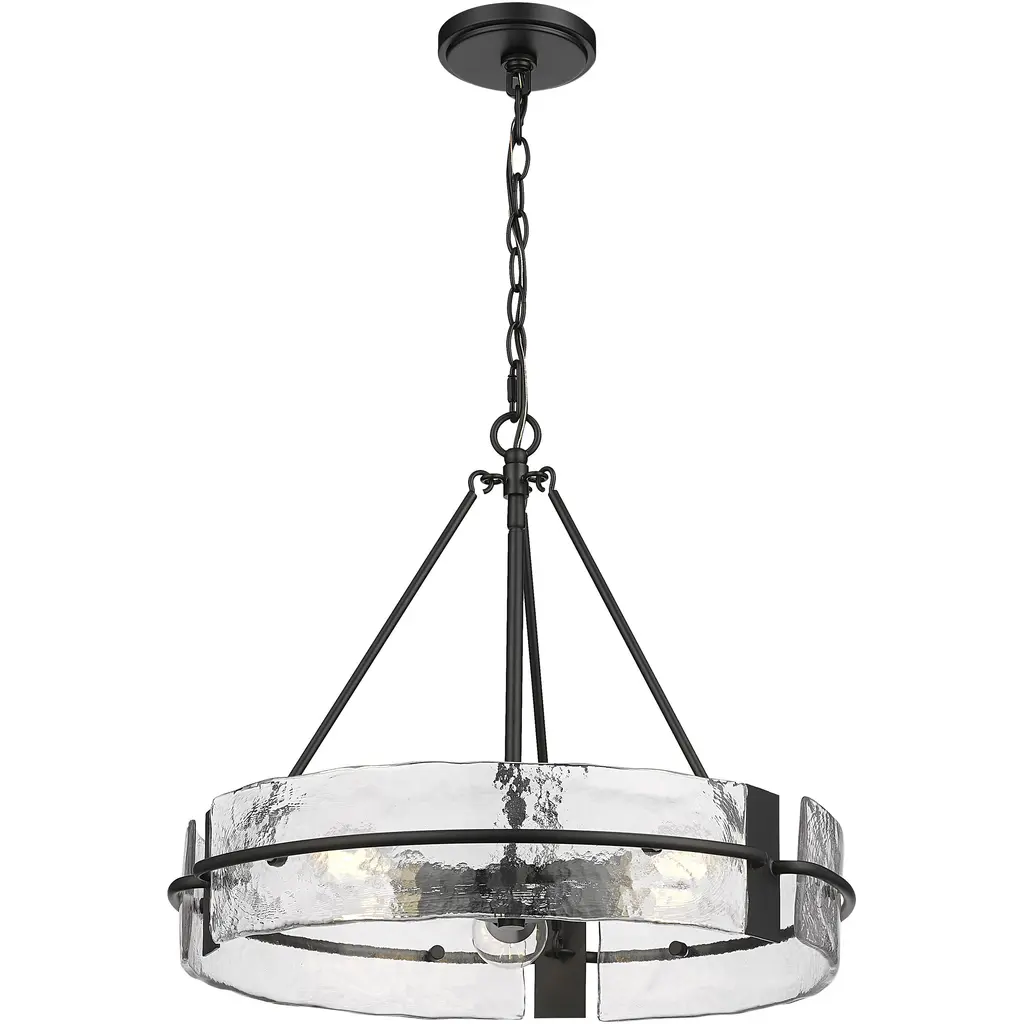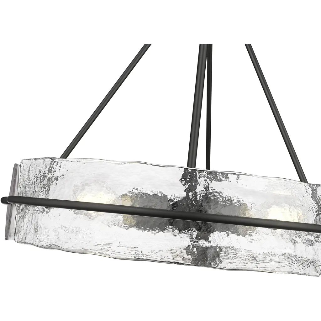 Clear hammered glass panels are the sparking stars of the Rezi Family. Featuring modern hardware supporting an understated minimalist framework, these fixtures are finished in matte black and are available as 1-light sconce and 3- or 4-light chandeliers. The stunning textured glass creates a glistening lighting effect for subtle and diffused illumination. Meticulously crafted, these fixtures are naturally inspired works of art that will enhance any interior space from entryway to dining room.