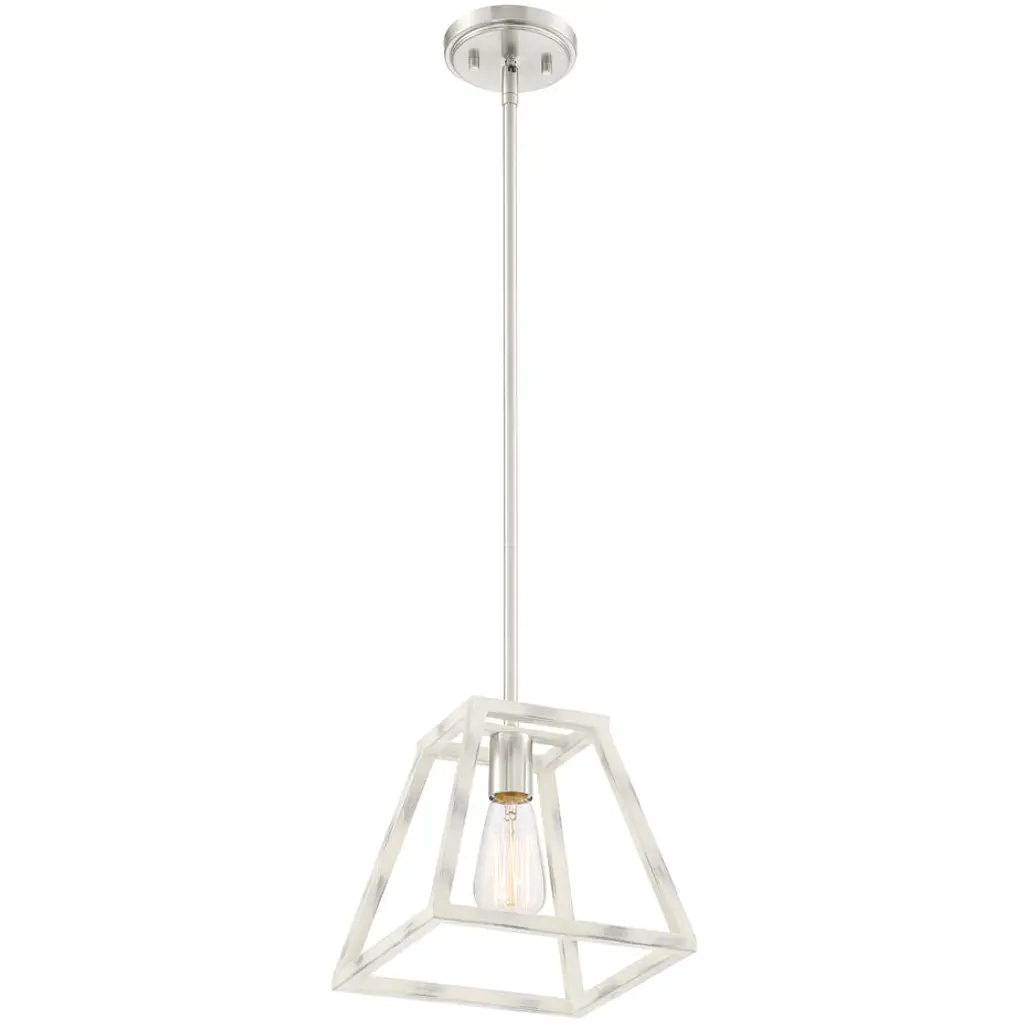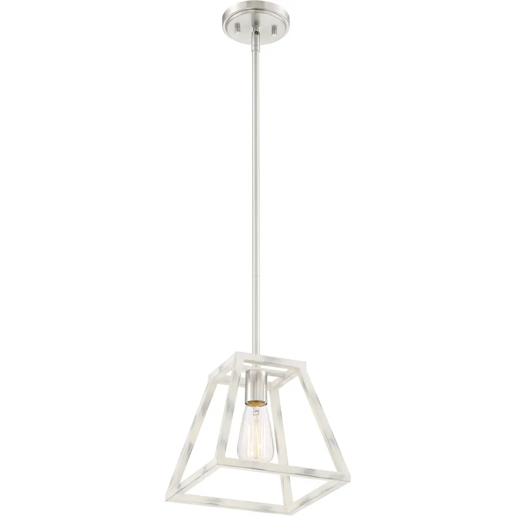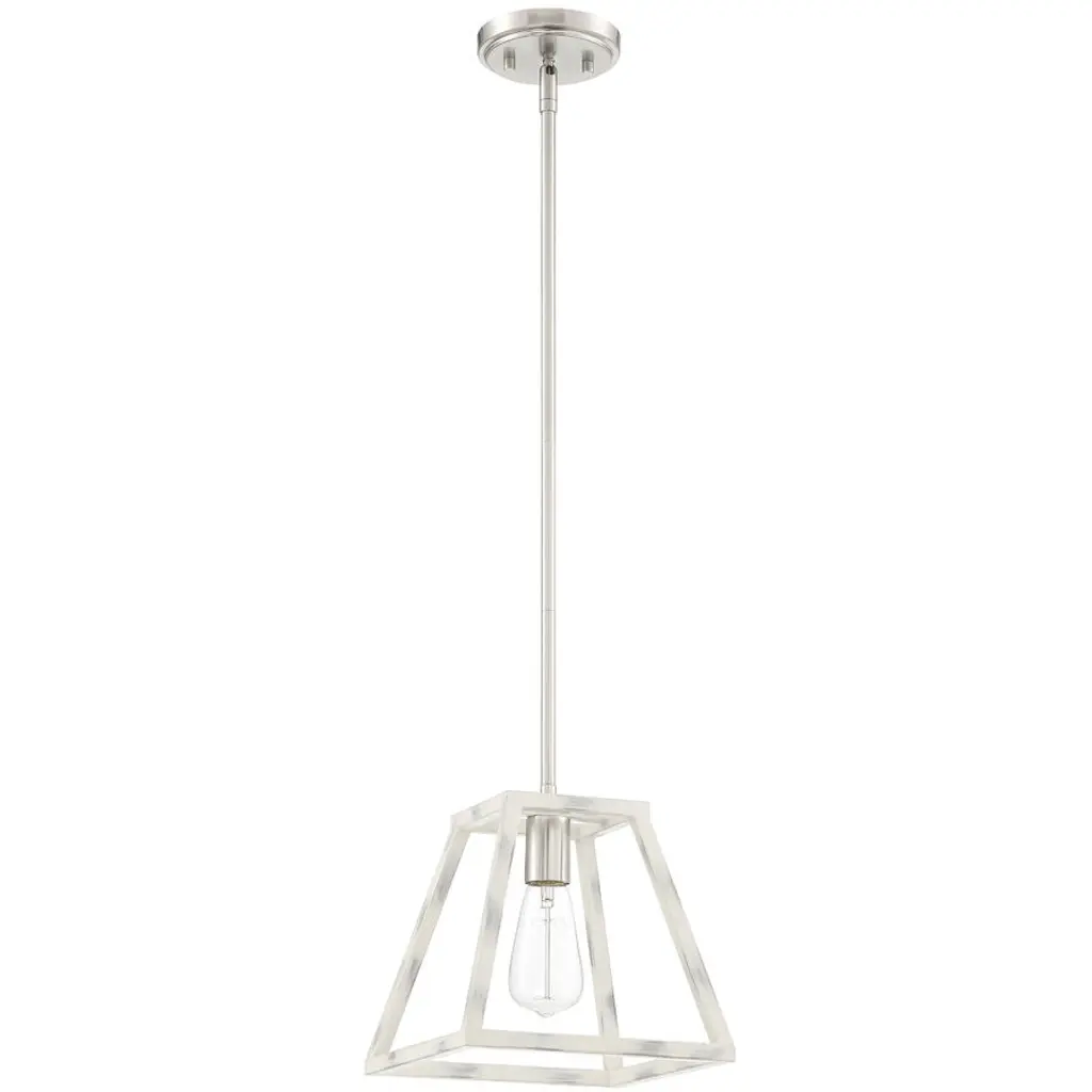 Satin Platinum finish silhouetted by a hand painted Coastal Weathered White Wood cage. The Rhode collection offers a modern elegance with timeless appeal. This hanging mini pendant is designed to be the star of your kitchen. It's designed for easy installation over kitchen counters and islands. Satin Platinum finsh silhouetted by a hand painted Coastal Weathered White Wood cage. The Rhode collection offers a modern elegance with timeless appeal.