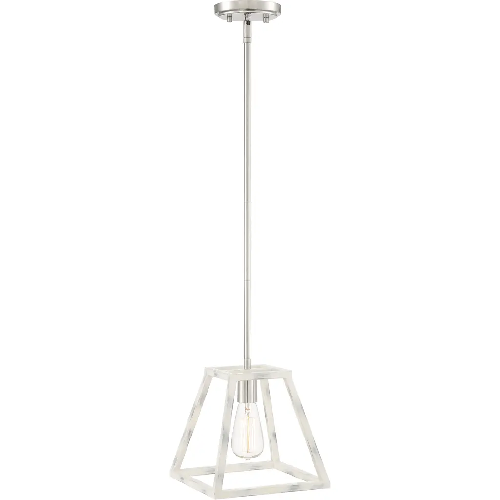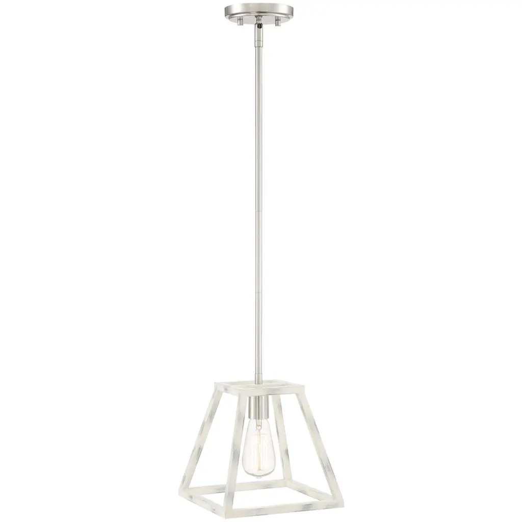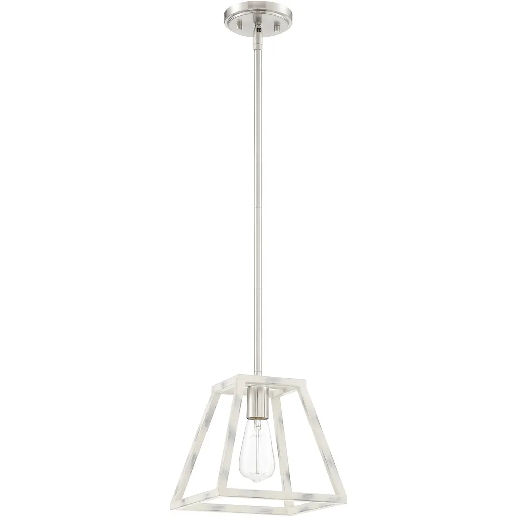 Satin Platinum finish silhouetted by a hand painted Coastal Weathered White Wood cage. The Rhode collection offers a modern elegance with timeless appeal. This hanging mini pendant is designed to be the star of your kitchen. It's designed for easy installation over kitchen counters and islands. Satin Platinum finsh silhouetted by a hand painted Coastal Weathered White Wood cage. The Rhode collection offers a modern elegance with timeless appeal.